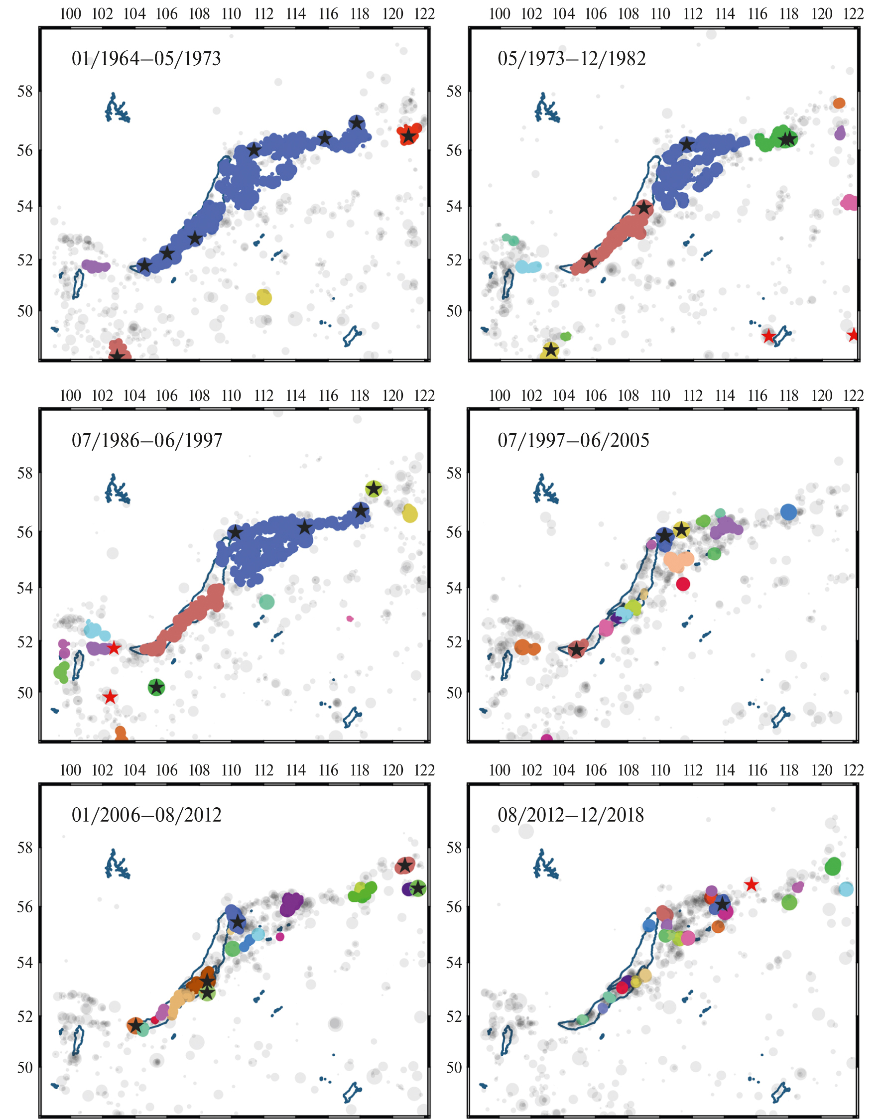 По результатам применения алгоритма DPS к эпицентрам землетрясений, зарегистрированным на территории БРЗ в течение шести непересекающихся временных интервалов, с 1964 по 2018 гг., выявлены изменения общего характера пространственного распределения эпицентров, а именно: кластеры в интервалах с января 1964 по май 1973 гг., с мая 1973 по декабрь 1982 гг. и с июля 1986 по июнь 1997 гг. имеют линейный размер порядка несколько сотен километров. 1548 эпицентров из 2423, зарегистрированных с января 1964 по май 1973 гг., формируют единый кластер на территории всего Байкальского рифта. Область этого кластера разбивается на 3 (для эпицентров землетрясений, зарегистрированных с мая 1993 по декабрь 1982 гг.) или на 2 (для эпицентров землетрясений, произошедших с июля 1986 по 1997 гг.).