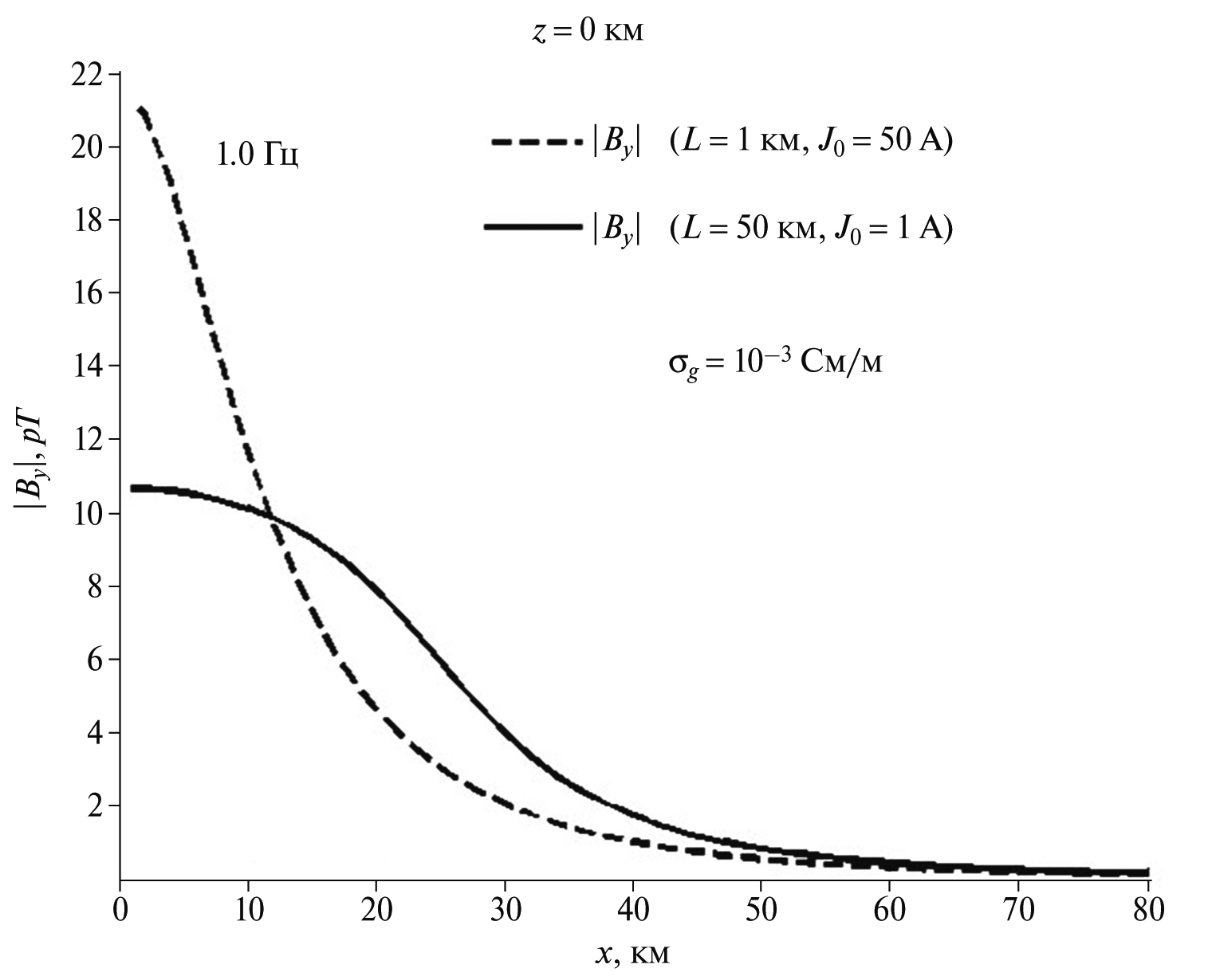 С этой целью была рассчитана пространственная структура возбуждаемого поля для км и для L = 1 км, но при тех же параметрах среды. Сила тока подбиралась так, чтобы токовый момент обоих источников был одинаковым (рис. 2). Сопоставление показывает, что поле источника конечных размеров на больших удалениях спадает медленнее, чем поле точечного диполя. Непосредственно над источником с масштабом L = 50 км величина магнитного возмущения на земной поверхности достигает ∼10 пТл.