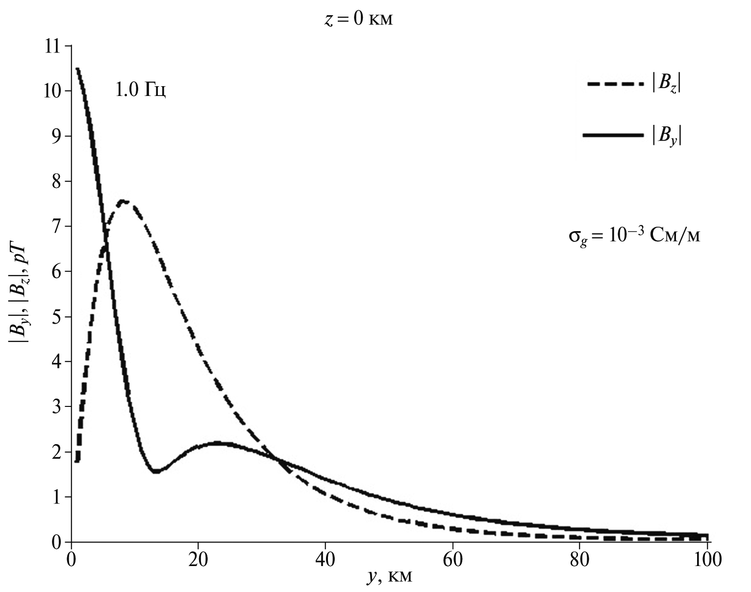 На земной поверхности УНЧ поля измеряются преимущественно магнитометрами, поэтому мы приводим результаты расчетов горизонтальных магнитных компонент и и вертикальной компоненты Bz. Измерения электротеллурического поля (Ex- и Ey-компоненты) также ведутся, хотя и не столь широко. Возможные УНЧ электромагнитные предвестники были обнаружены на сравнительно малых удалениях от эпицентра [Hattori, 2004], поэтому расчеты проводились до расстояний по горизонтали не более 200 км.