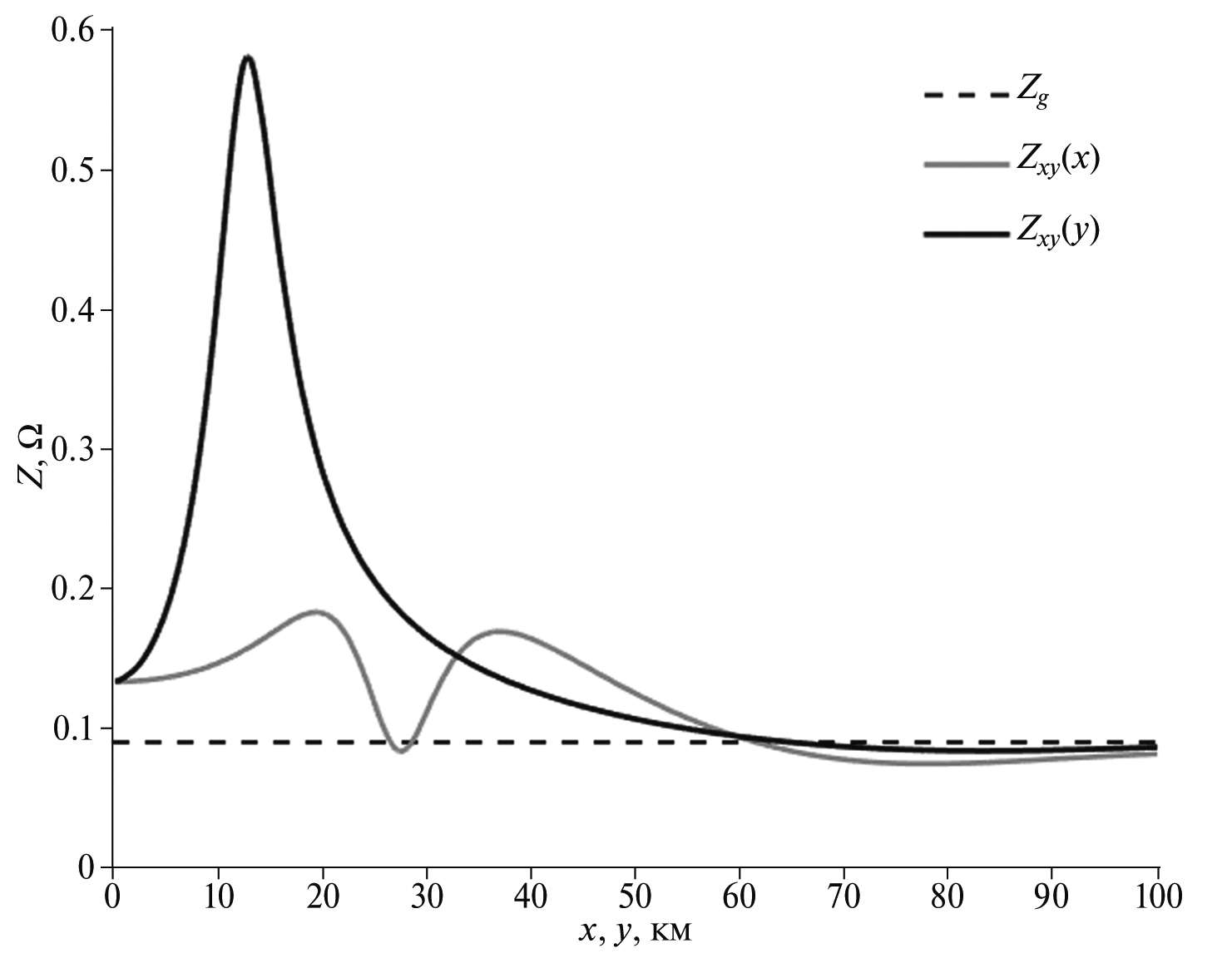Одно из отличий поля магнитосферно-ионосферного и подземного источников видно на рис. 3, где показано пространственное распределение горизонтальной и вертикальной магнитных компонент в направлении поперек токового источника (по оси y). Горизонтальная компонента имеет максимум при т.е. непосредственно над источником. Величина же вертикальной компоненты над источником проходит через нулевое значение и достигает максимума на удалении ∼15 км.