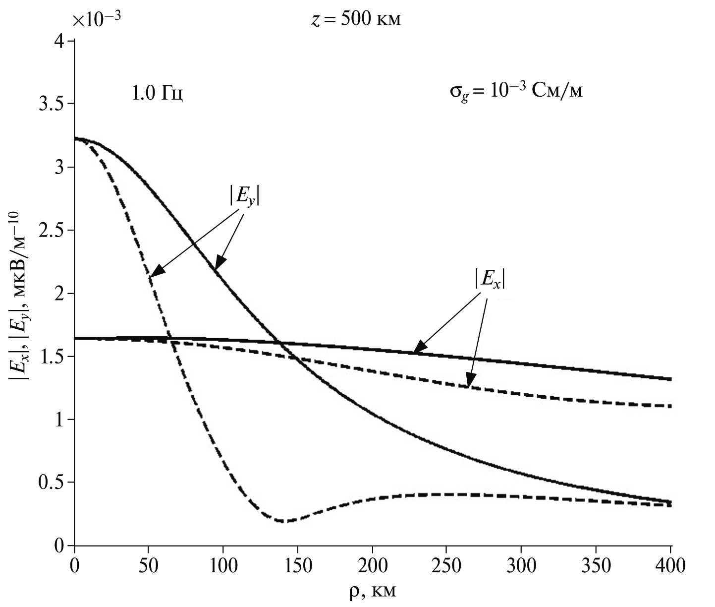 Спутниковые измерения УНЧ и КНЧ полей преимущественно ведутся электрическими антеннами, которые более чувствительны к электромагнитным возмущениям, чем бортовые магнитометры. Для интерпретации спутниковых наблюдений сигналов, предположительно вызванных сейсмическими источниками, проведены расчеты амплитуды поперечных электрических составляющих и на высоте км (рис. 5). При Гц максимальное возмущение непосредственно над источником с J0 = 1 A и L = 50 км достигает мкВ/м.