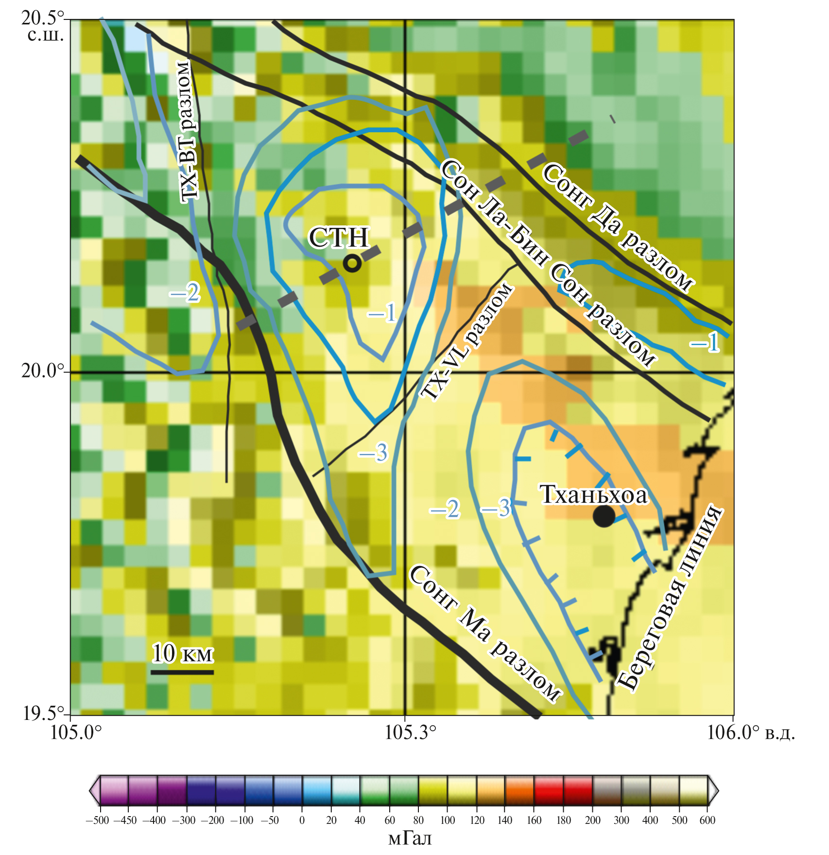 Рис. 1. Тектоническое строение района исследований, наложенное на карту аномалий глобальной модели гравитационного поля в редукции Буге WGM2012 по работе [Bonvalot et al., 2012], и положение пункта измерений CTH. Толстыми черными линиями изображены региональные разломы, тонкими – локальные. Голубыми линиями оконтурены глубины в км (голубые числа) до кристаллического основания по данным интерпретации регионального гравитационного поля по работе [Duong et al., 2021]. Пунктиром, проходящим через пункт измерения, обозначено преимущественное направление электрического поля.