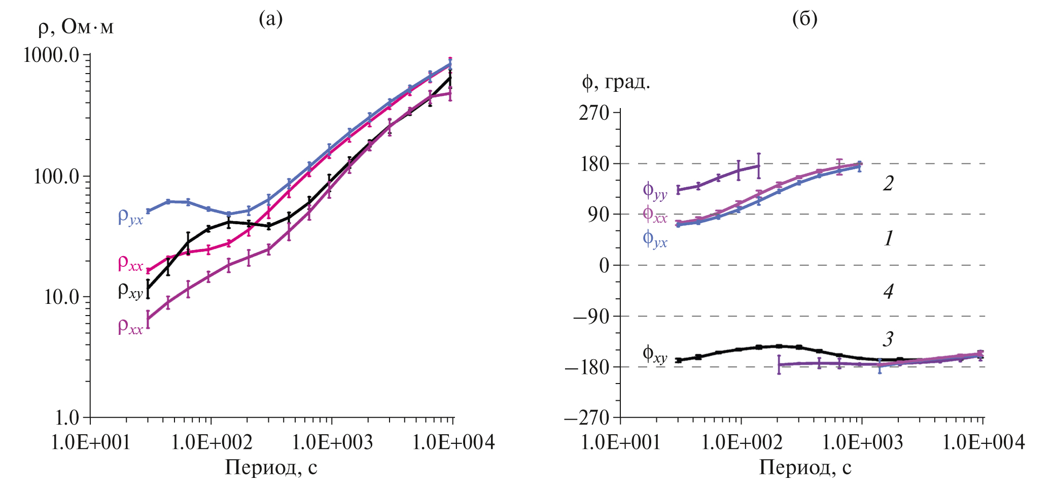 Рис. 3. Амплитудные (а) и фазовые (б) кривые кажущегося сопротивления в пункте CTH, полученные в результате обработки МТ вариаций и их стандартные отклонения. Цифрами на графике (б) пронумерованы квадранты фаз.