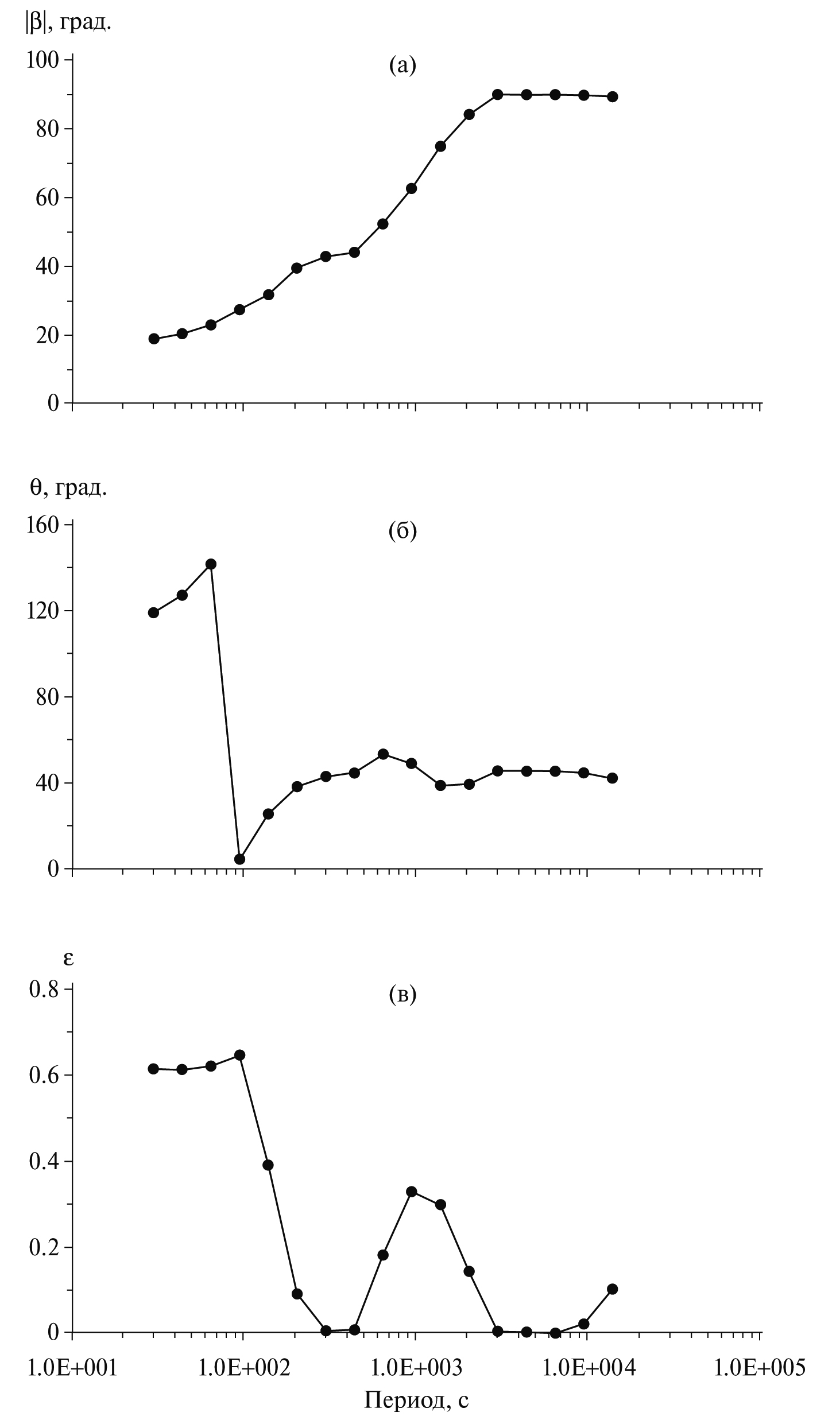 На графике рис. 4б представлено направление большой оси эллипса фазового тензора, выражающееся углом, отсчитываемым от оси x с положительными значениями в направлении движения часовой стрелки. Углы рассчитывались как разность значений и в выражениях (16), (15), соответственно. Видно, что в области длинных периодов большая ось эллипса устанавливается в направлении на СВ, что близко к преимущественному направлению электрического поля, изображенному на рис. 2. При определении простирания геологической структуры по углу необходимо учитывать, что оно будет определяться с 90° неопределенностью [Bibby et al., 2005].