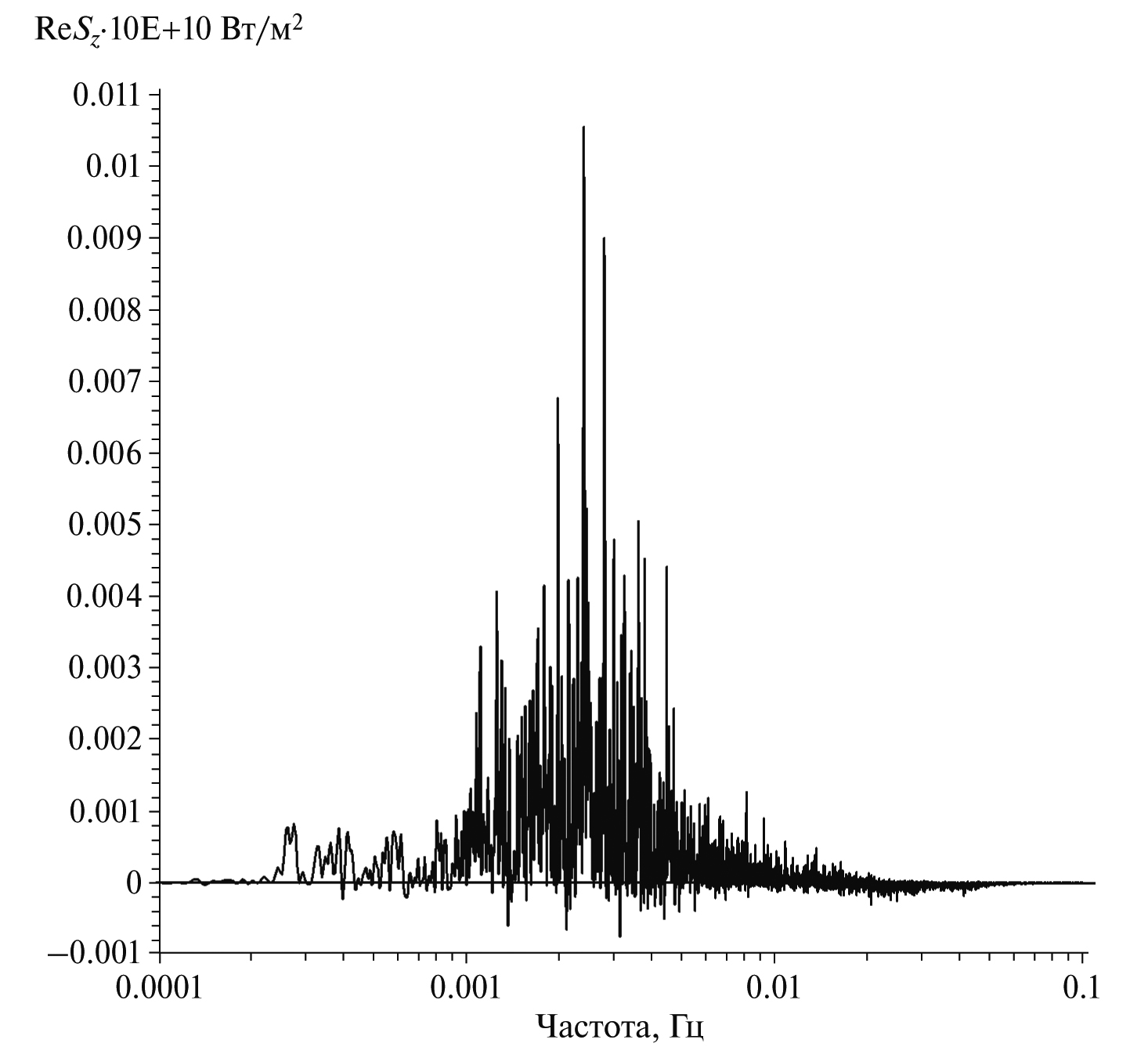 Рис. 5. Вертикальная компонента среднего потока энергии в спектральной области после полосовой фильтрации исходной реализации с полосой пропускания фильтра 5–1000 с.