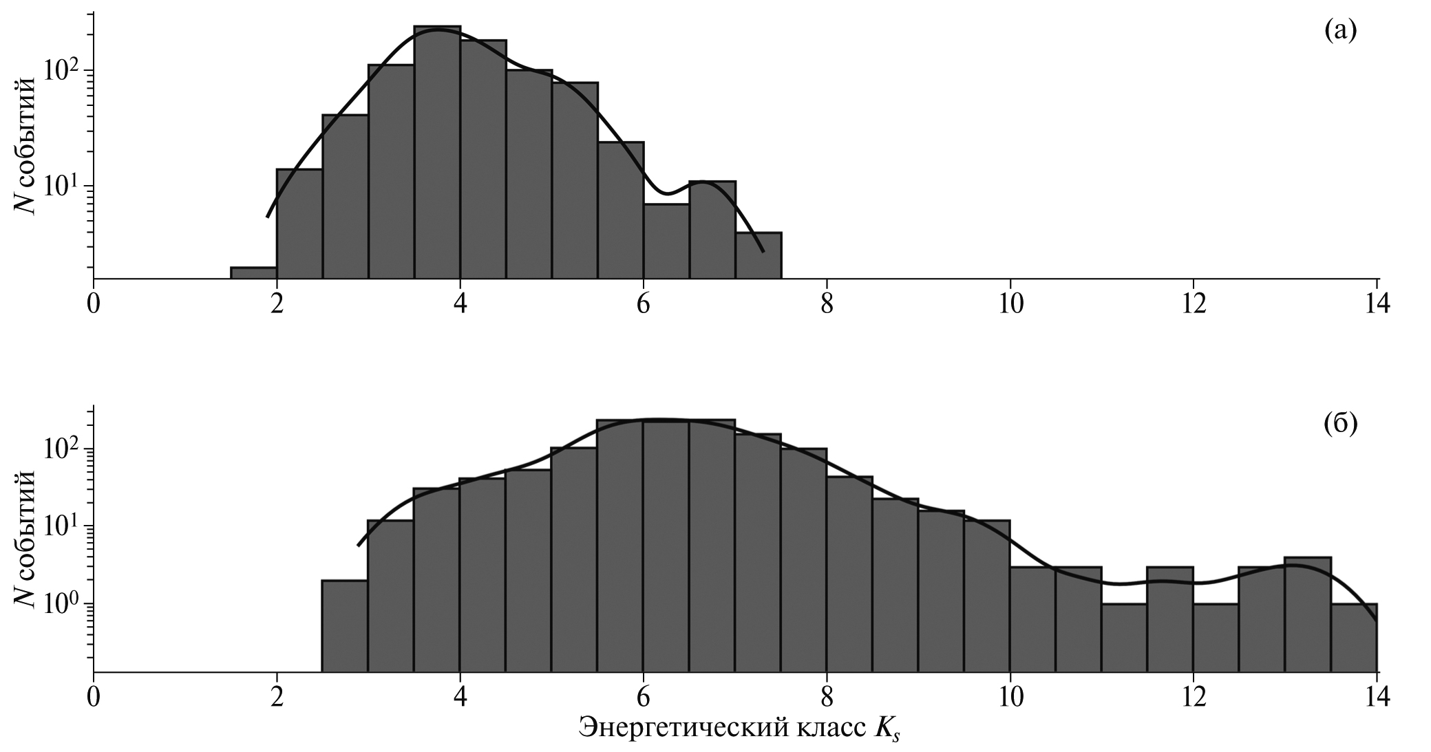 Рис. 5. Гистограммы распределения землетрясений из каталога по данным сети станций KAGSR+KISS в зависимости от энергетического класса Ks: (а) – вулканические землетрясения; (б) – региональные землетрясения. Черная линия – результат аппроксимации методом оценки формы распределения с помощью ядра Гаусса.
