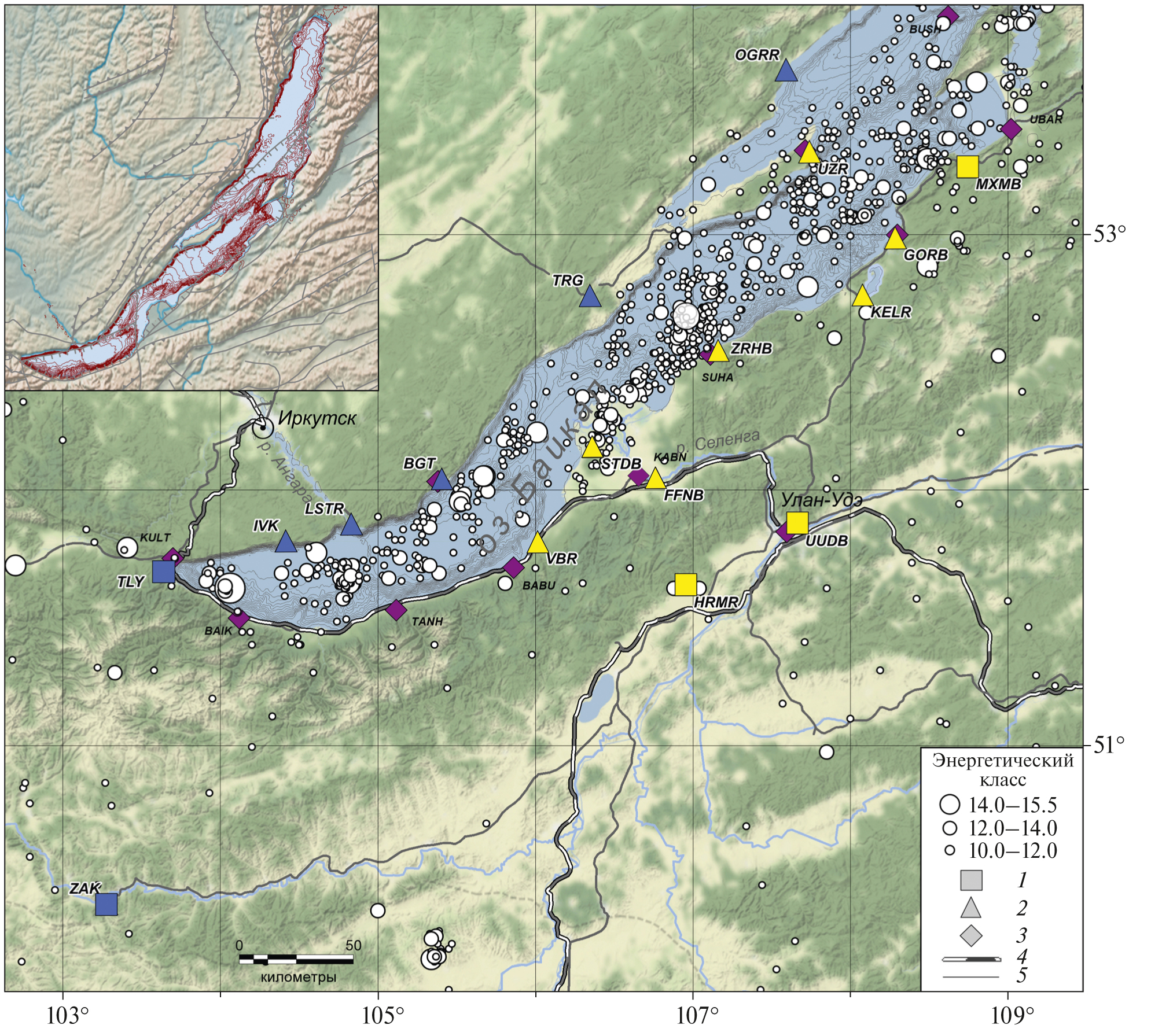 Рис. 1. Сейсмичность центральной части Байкальского рифта с 1960 по 2022 гг. (с Kр ≥ 10, http://www.seis-bykl.ru): 1 – широкополосные сейсмостанции; 2 – короткопериодные сейсмостанции; 3 – метеостанции; 4, 5 – дороги. Желтым показаны станции ГИН СО РАН и Бурятского филиала ФИЦ ЕГС РАН (БуФ); синим – станции Байкальского филиала ФИЦ ЕГС РАН (БФ). На врезке показаны изобаты глубины оз. Байкал по данным сайта https://www.noaa.gov и основные разломы по работе [Лунина, 2016].