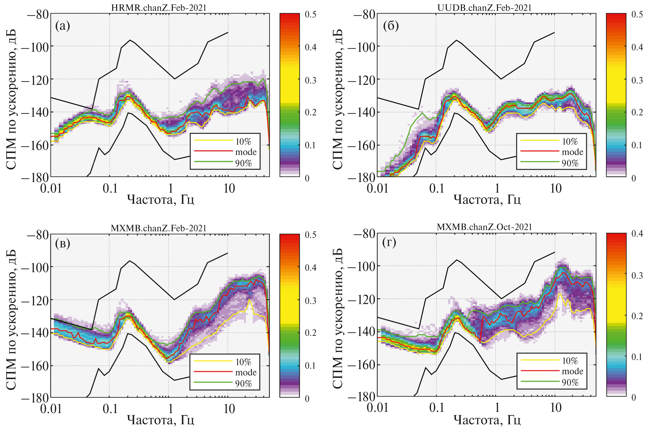 Рис. 2. Плотность вероятности распределения спектральной плотности мощности микросейсмического шума вертикальной компоненты ускорения грунта (цветовая шкала): (а) – с/c Хурамша (HRMR); (б) – с/c Улан-Удэ (UUDB) за февраль 2021 г.; (в) – с/с Максимиха (MXMB) за февраль; (г) – октябрь 2021 г. Черные линии – минимальный и максимальный уровень шума по работе [Peterson, 1993]; красная линия – статистическая мода; желтая линия – 10 процентиль; зеленая линия – 90 процентиль плотности вероятности.