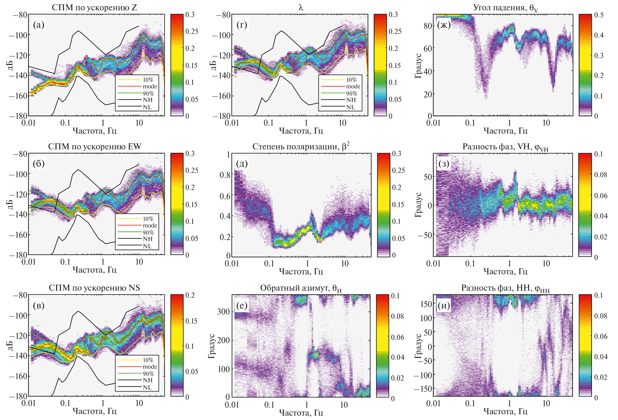 Рис. 3. Плотность вероятности распределения значений поляризационных атрибутов (цветовая шкала), полученные для станции Максимиха за октябрь 2020 г.: (а) – СПМ компоненты Z; (б) – EW; (в) – NS; (г) – наибольшее собственное значение λmax; (д) – степень поляризации β2; (е) – азимутальная ориентация эллипсоида поляризации θH; (ж) – θV, угол падения; (з) – разность фаз между радиальной и вертикальной составляющими ϕVH; (и) – разность фаз между горизонтальными компонентами ϕHH.