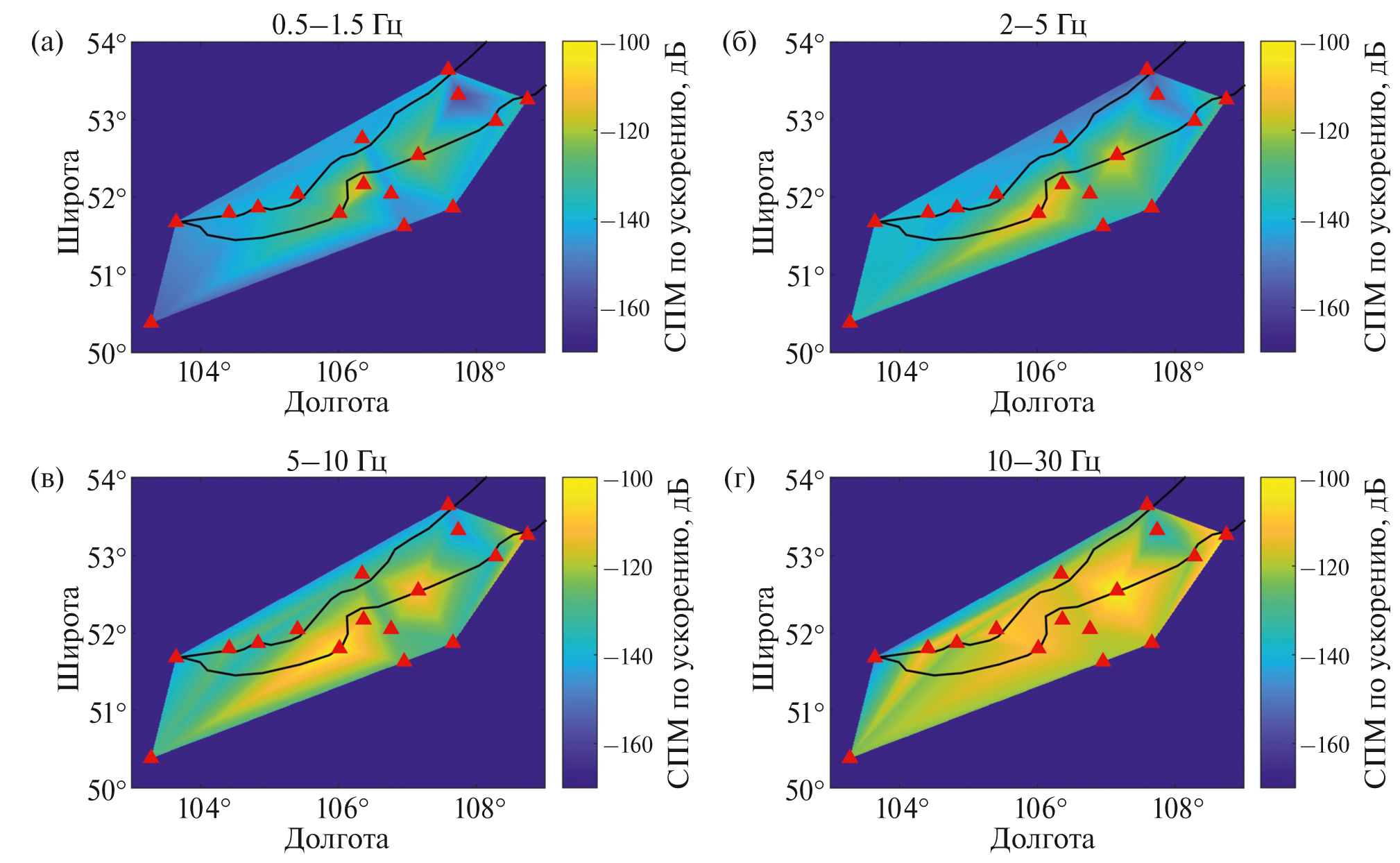 Рис. 4. Распределение моды плотности вероятности СПМ ускорения грунта (Z компонента) на территории Прибайкалья в разных диапазонах частот: (а) – 0.5–1.5 Гц; (б) – 2–5 Гц; (в) – 5–10 Гц; (г) – 10–30 Гц в августе 2020 г.