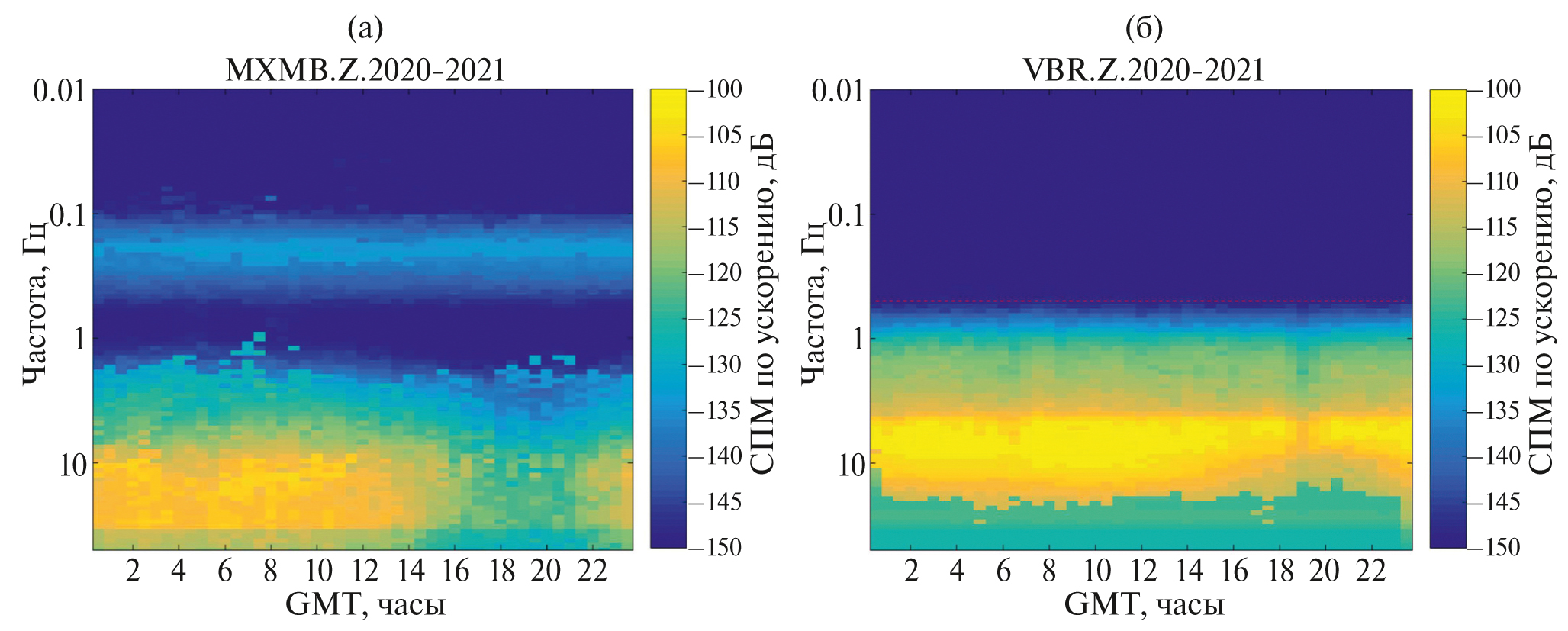 Рис. 5. Суточные вариации микросейсмического шума за 2020–2021 гг. для станций: (а) – Максимиха (MXMB); (б) – Сухой ручей (VBR); пунктир соответствует нижней граничной полосе короткопериодных датчиков 0.5 Гц. Местное время +8 ч.