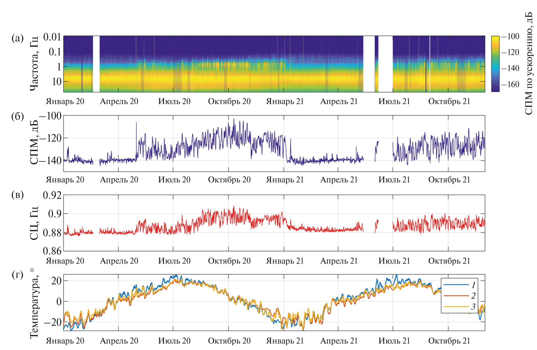 Рис. 7. Спектральный анализ данных станции Сухой ручей (VBR) за 2020–2021 гг.: (а) – спектрограмма (пунктир соответствует нижней граничной полосе короткопериодных датчиков 0.5 Гц); (б) – СПМ ускорения грунта в диапазоне 0.5–1.5 Гц; (в) – спектральный центроид в диапазоне 0.5–1.5 Гц; (г) – вариации температуры по данным нескольких метеостанций региона (1 – UUDB, 2 – GORB, 3 – BGT). Станция Сухой ручей (VBR) находится на расстоянии около 1 км от береговой линии оз. Байкал.