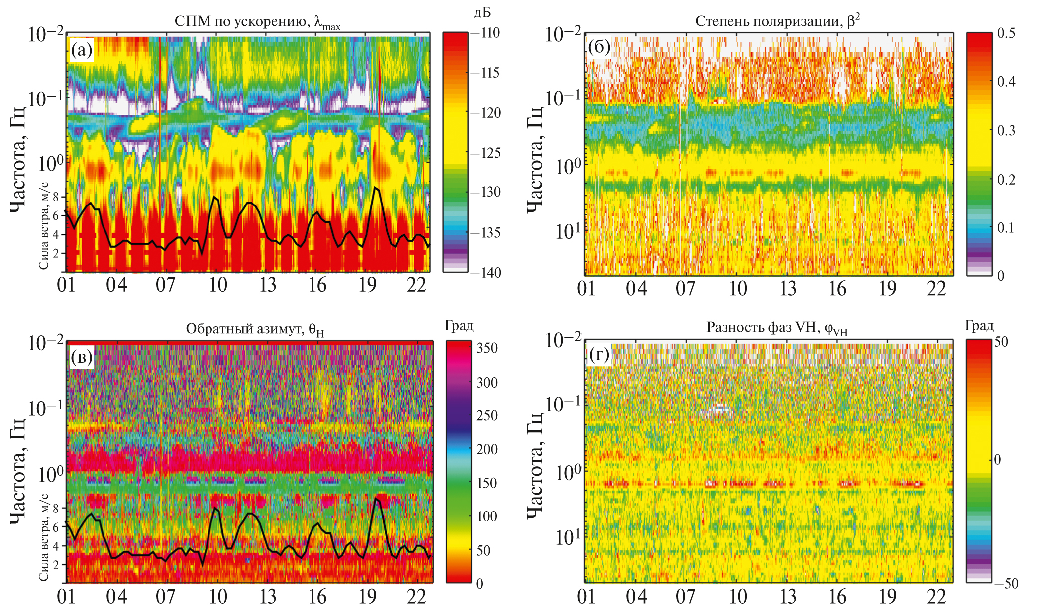 На спектрограмме наибольшего собственного значения λMAX (рис. 8а), обратим внимание на уменьшение нижней частоты ОЗМ до 0.3 Гц в периоды интенсивной ветровой нагрузки по сравнению с безветренными интервалами. Таким образом, происходит перекрытие частотных полос вторичных и озерных микросейсм. Спектрограммы β2, ϕHH, θV, позволяют достаточно четко обозначить частотный диапазон ОЗМ 0.4–1.5 Гц и отделить их от вторичных (0.1–0.4 Гц) и высокочастотных (>2 Гц) микросейсм. Наиболее информативными атрибутами поляризации для выделения ОЗМ во времени оказались обратный азимут θH и вертикальная радиальная разность фаз ϕVH. На спектрограмме θH видно, что в периоды усиления ветра, совпадающие с пиками СПМ озерных микросейсм, обратный азимут на источник находится в северном направлении от сейсмостанции.