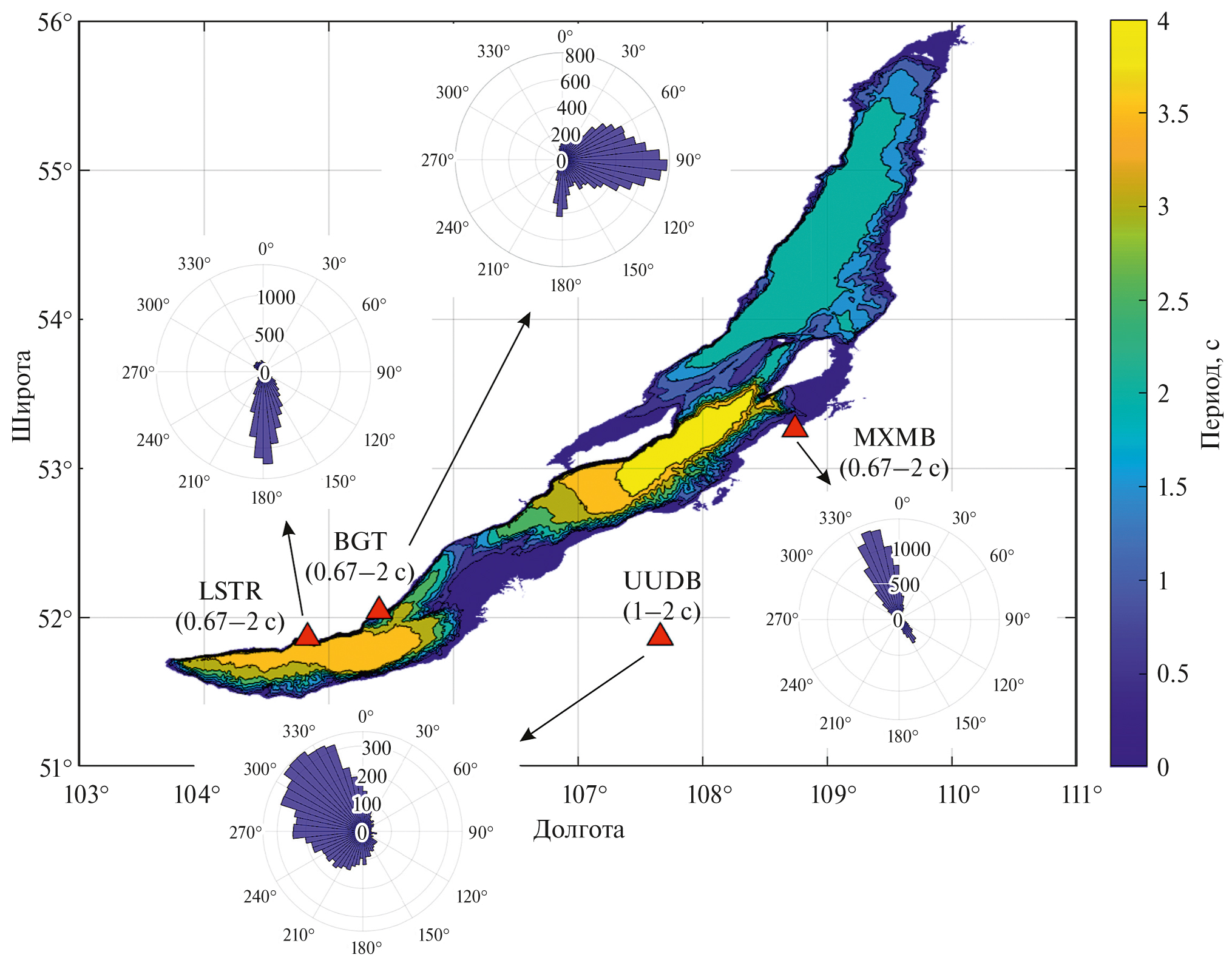 Рис. 9. Диаграммы направленности обратного азимута для сейсмических станций Листвянка (LSTR, ∼90 м от берега); Б. Голоустное (BGT, ∼400 м от берега); Максимиха (MXMB, ∼700 м от берега); Улан-Удэ (UUDB, ∼84 км от берега) в диапазоне частот 0.5–1.5 Гц (для станции UUDB – 0.5–1 Гц) за октябрь 2020 г. Периоды, в которые происходит усиление микросейсм (аналог вторичных океанических микросейсм) в зависимости от глубины оз. Байкал по модели в работах [Longuet-Higgins, 1950; Tanimoto, 2013].