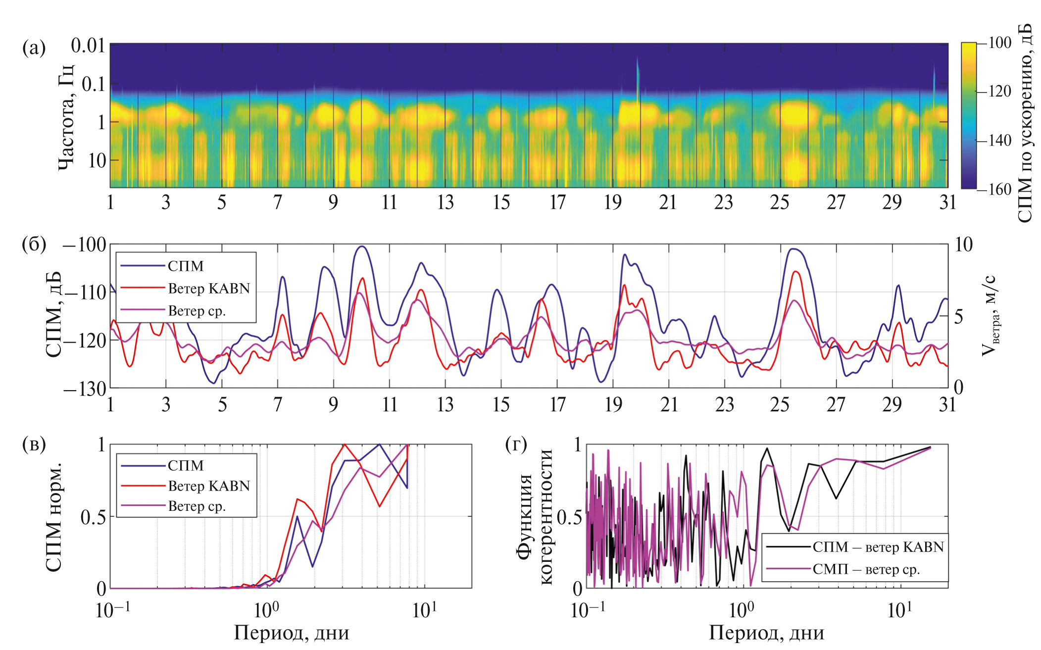 Рис. 10. Параметры микросейсмического фона на станции Степной дворец (STDB) за октябрь 2020 г.: (а) – СПМ ускорения грунта; (б) – СПМ ускорения грунта в полосе 0.5–1.5 Гц, скорость ветра по данным метеостанции KABN и средняя по всем метеостанциям; (в) – их нормированные спектры; (г) – функция когерентности между СПМ ускорения грунта в полосе 0.4–1.5 Гц и скоростью ветра по данным метеостанции KABN и средней скоростью ветра по всем метеостанциям.