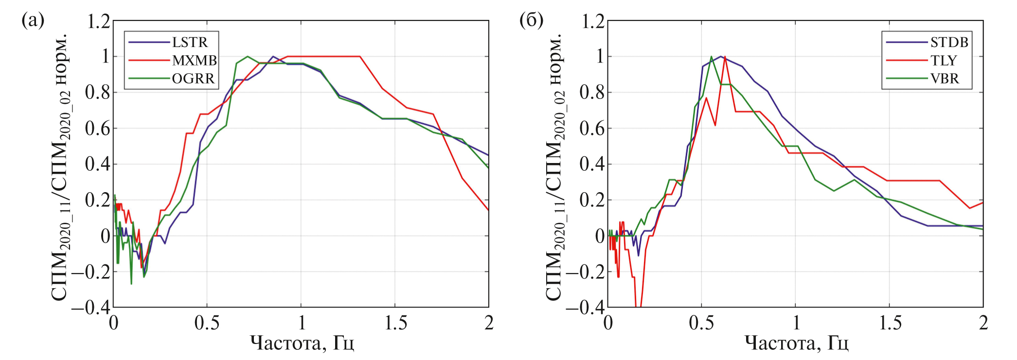 Рис. 11. Отношения СПМ ускорения грунта, рассчитанной за ноябрь 2020 г., к СПМ, рассчитанной за февраль 2020 г., нормированные на максимум. Станции с характерным диапазоном частот: (а) – 0.4–1.5 Гц (LSTR, MXMB, OGGR); (б) – 0.4–0.7 Гц (TLY, STDB, VBR) на уровне ∼0.7.