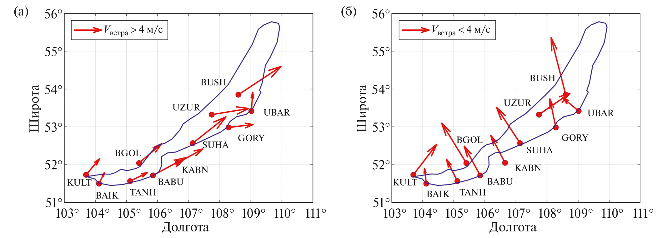 Рис. 12. Среднее направление ветра на метеостанциях вблизи оз. Байкал за октябрь 2020 г. при скорости ветра больше 4 м/с (а) и меньше 4 м/с (б).