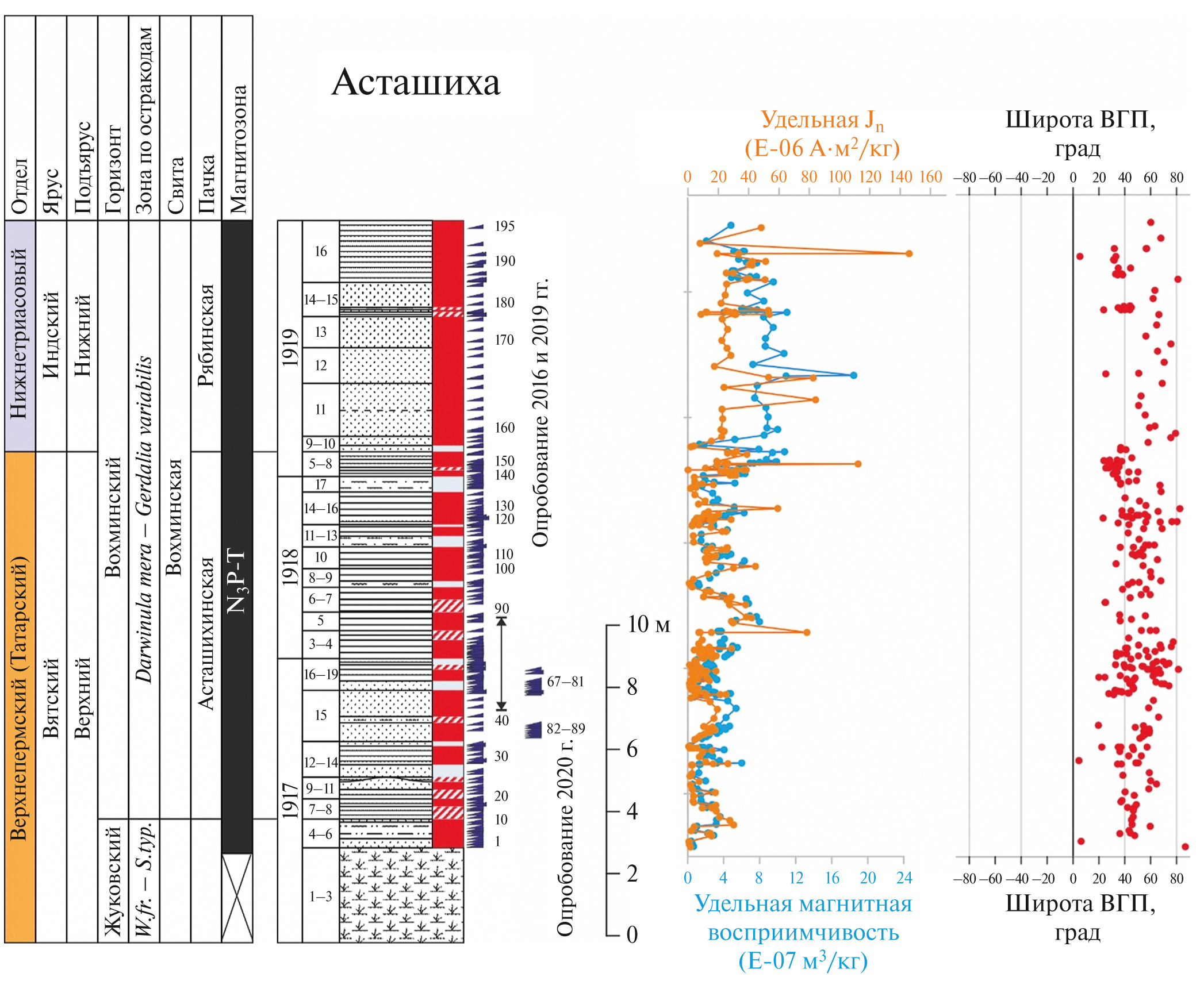 Рис. 10. Асташиха: стратиграфия, литология, схема опробования с номерами образцов, удельная естественная остаточная намагниченность (Jn) и удельная магнитная восприимчивость, широта виртуального геомагнитного полюса (ВГП). Условные обозначения см. на рис. 6.