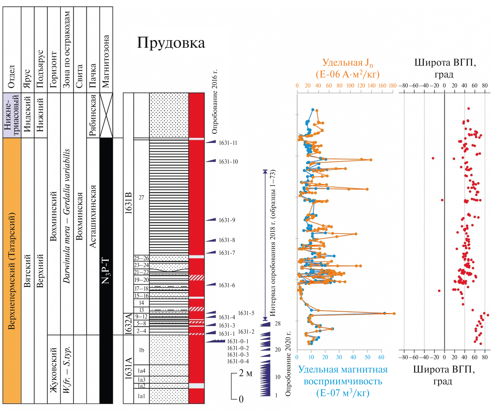 Рис. 11. Прудовка: стратиграфия, литология, схема опробования с номерами образцов, удельная естественная остаточная намагниченность (Jn) и удельная магнитная восприимчивость, широта виртуального геомагнитного полюса (ВГП). Условные обозначения см. на рис. 6.