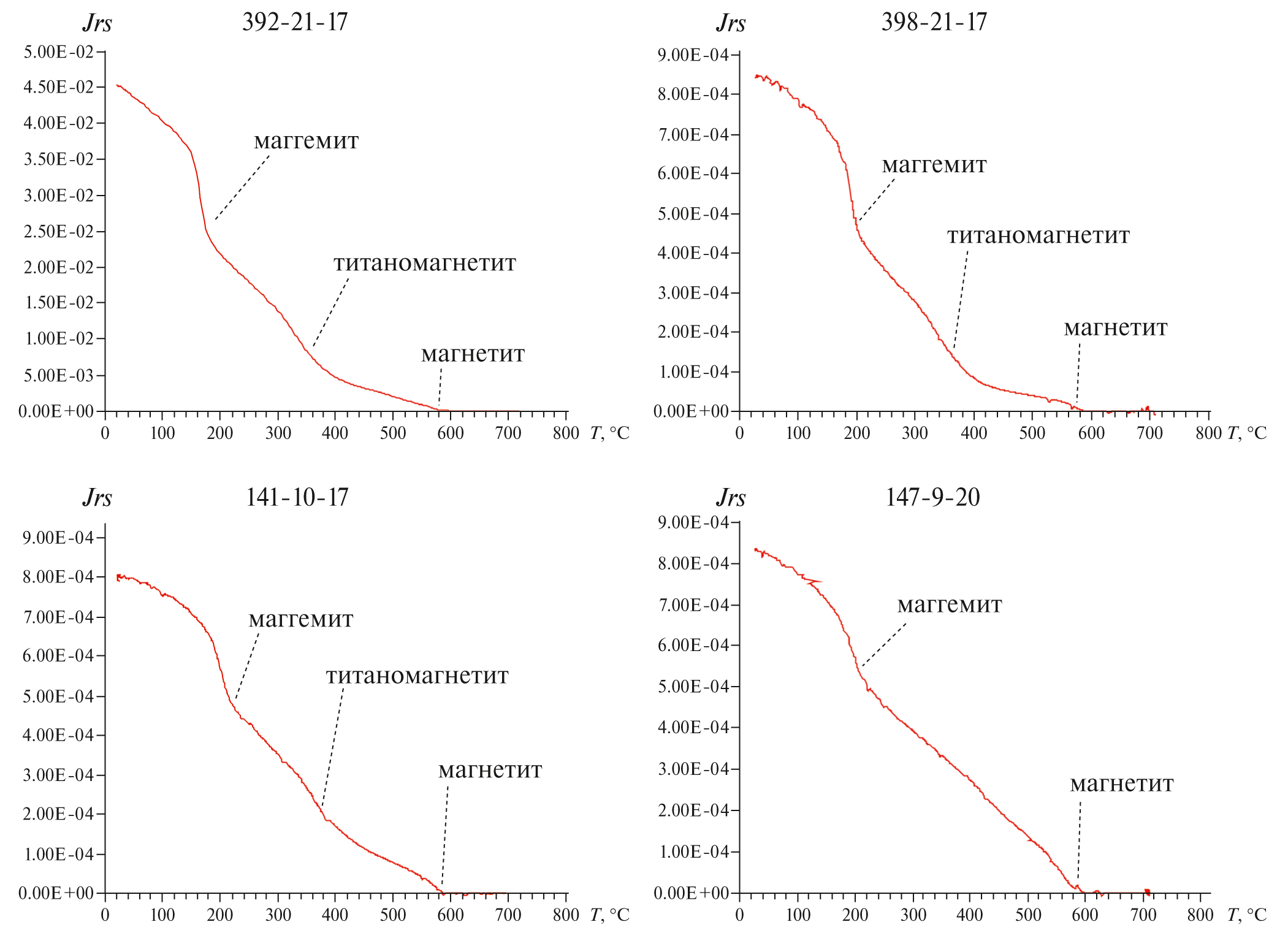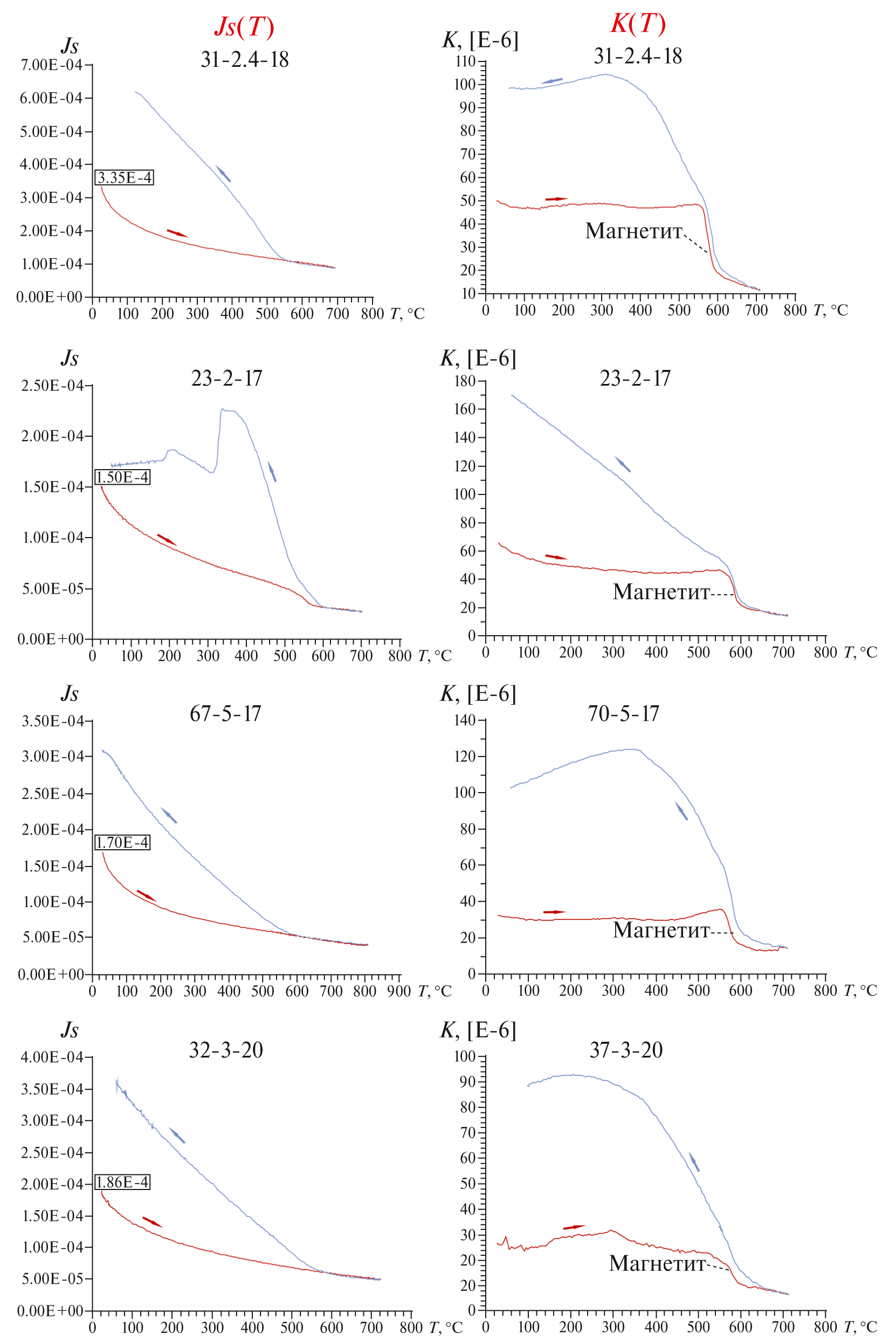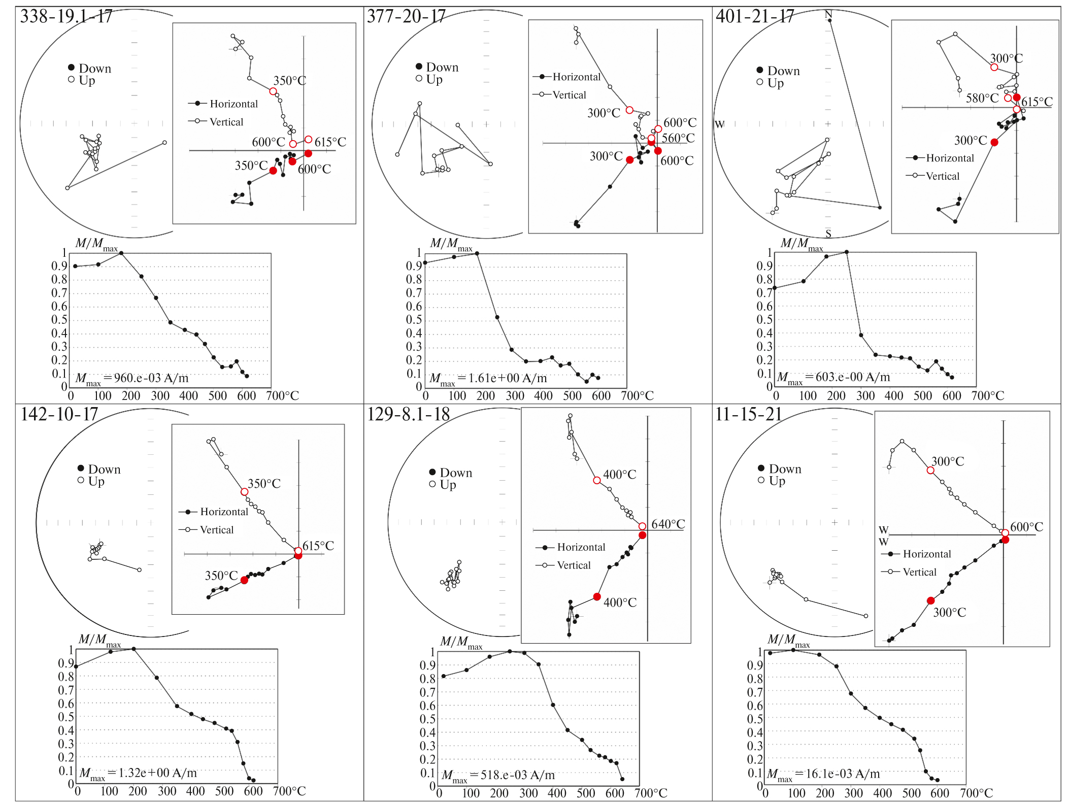Лабораторные палеомагнитные исследования и обработка результатов магнитных чисток выполнялись в лаборатории Главного геомагнитного поля и петромагнетизма ИФЗ РАН. Все образцы были подвергнуты ступенчатой температурной чистке до полного размагничивания (8–17 шагов), которое достигалось в большинстве случаев при температурах 540–680°С, или до появления хаотической палеомагнитной записи, связанной с минеральными новообразованиями при температурной чистке. Для размагничивания образцов использовались немагнитные печи “MMTD-80” и “MMTD24” с величиной нескомпенсированного поля не более 5–10 нТл. В ряде случаев для проверки дубли образцов подвергались чистке переменным полем. Остаточная намагниченность образцов измерялась при помощи спин-магнитометра JR-6 AGICO или криогенного магнитометра 2G Enterprises. Обработку измерений остаточной намагниченности выполняли при помощи пакетов программ Enkin [Enkin, 1994] и Remasoft [Chadima, Hrouda, 2006], использующих при выделении компонент намагниченности метод компонентного анализа согласно работе [Kirschvink, 1980]. Анализ полученных палеомагнитных данных производился с использованием статистики Фишера [Fisher, 1953]. Измерения зависимости магнитной восприимчивости от температуры проводились на каппометре MFK-1FA компании AGICO с термоприставкой CS3, на воздухе со скоростью нагрева/охлаждения 11–13°С/мин, измерения производились на порошке измельченных образцов. Зависимости намагниченности насыщения и остаточной намагниченности насыщения от температуры Js(T) и Jrs(T) измерялись на 1 см3 образцах на вибротермомагнитометре конструкции Ю.К. Виноградова. Js измерялась в полях в диапазоне 450–520 мТл при скорости нагрева/охлаждения 1°С/сек. Jrs создавалась в поле величиной 1 Тл, скорость нагрева/охлаждения – 1°С/с.