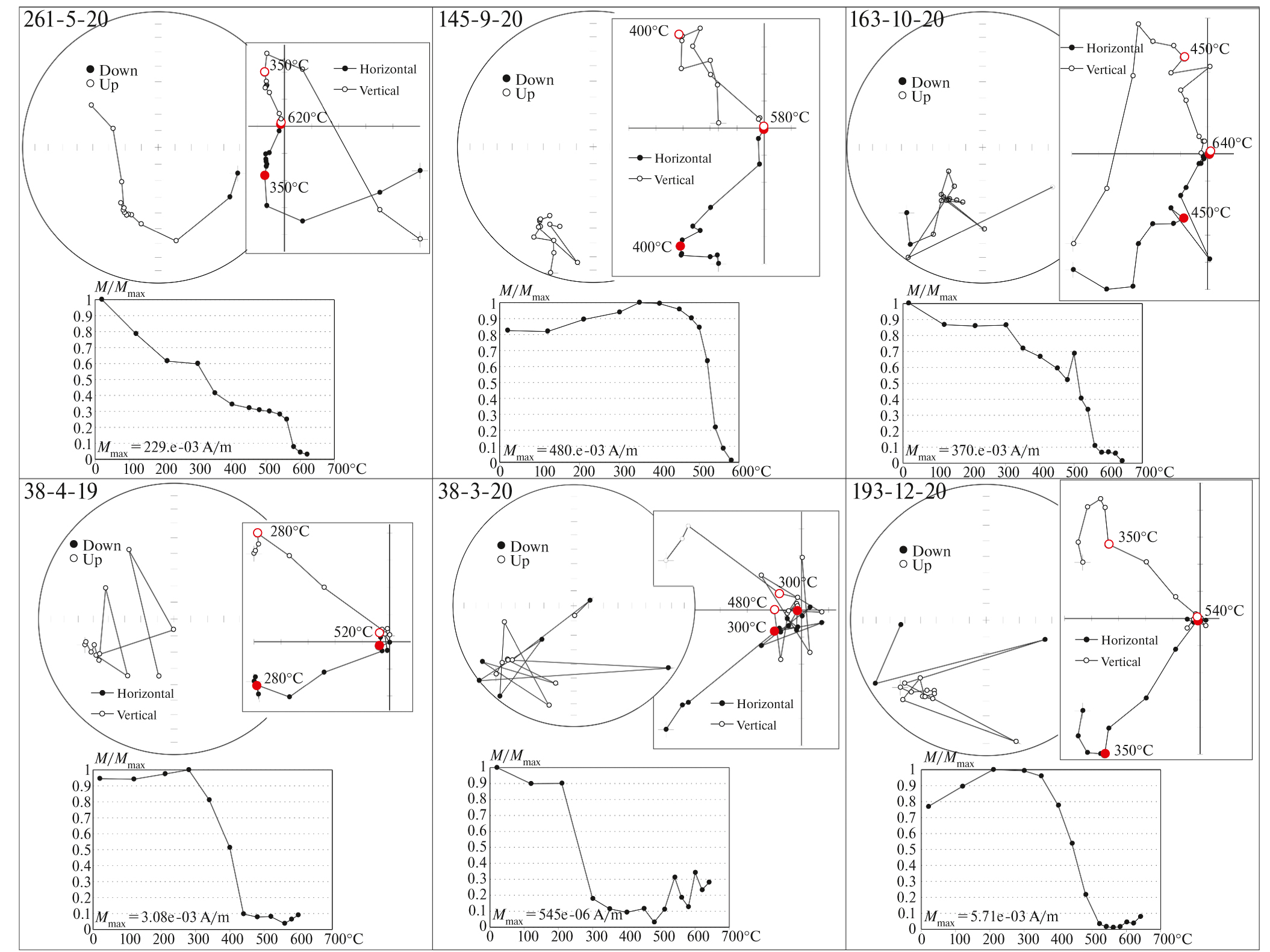 При оценке качества магнитной записи мы считаем запись хорошей, если компоненту можно однозначно выделить по прямой на диаграмме Зийдервельда (значения MAD, максимального углового отклонения, ∼10° и меньше) и соответствующей тесной группе точек на стереограмме, отсутствуют новообразования при ступенчатой температурной чистке, выделяемая компонента является единственной стабильной в образцах. Плохой мы считаем запись, когда сигнал хаотичен, значения MAD значительно превышают 20°, запись плохо интерпретируемая, происходят изменения в процессе температурной чистки. Промежуточные варианты мы обозначаем как среднее качество палеомагнитного сигнала.