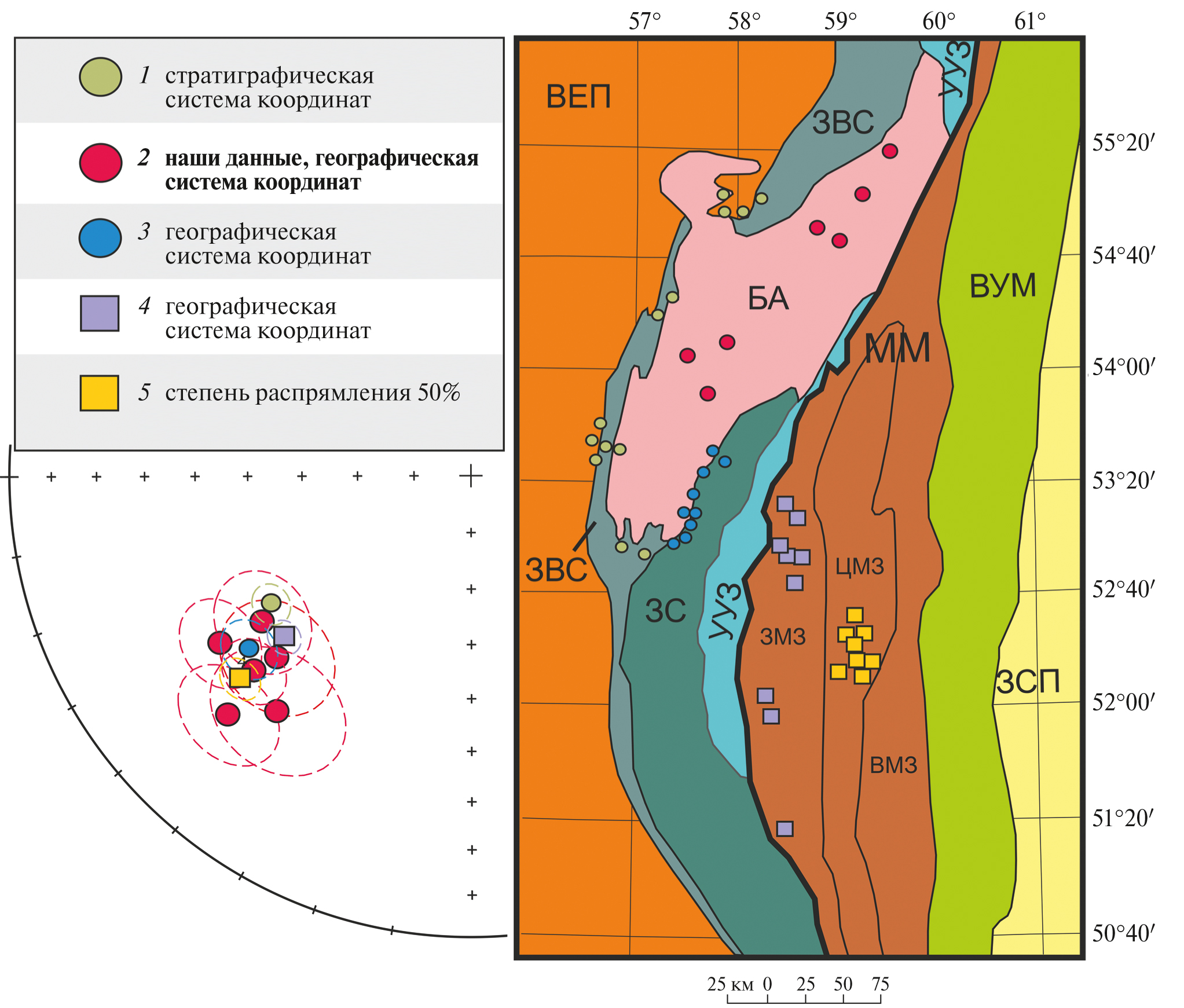 The Late Paleozoic remanence component yielded a paleomagnetic pole of Plong = 171.6°, Plat = 39.9°, α95 = 5.9°, N = 6 from 6 areas (38 sites) in the Bashkirian megazone. The obtained pole is statistically indistinguishable from the mean of 15 poles for Stable Europe with ages of 280–301 million years. Thus, the secondary Late Paleozoic component in the Bashkirian megazone formed approximately 280–301 million years ago, after which the Bashkirian megazone did not experience any relative motions with respect to the East European craton.