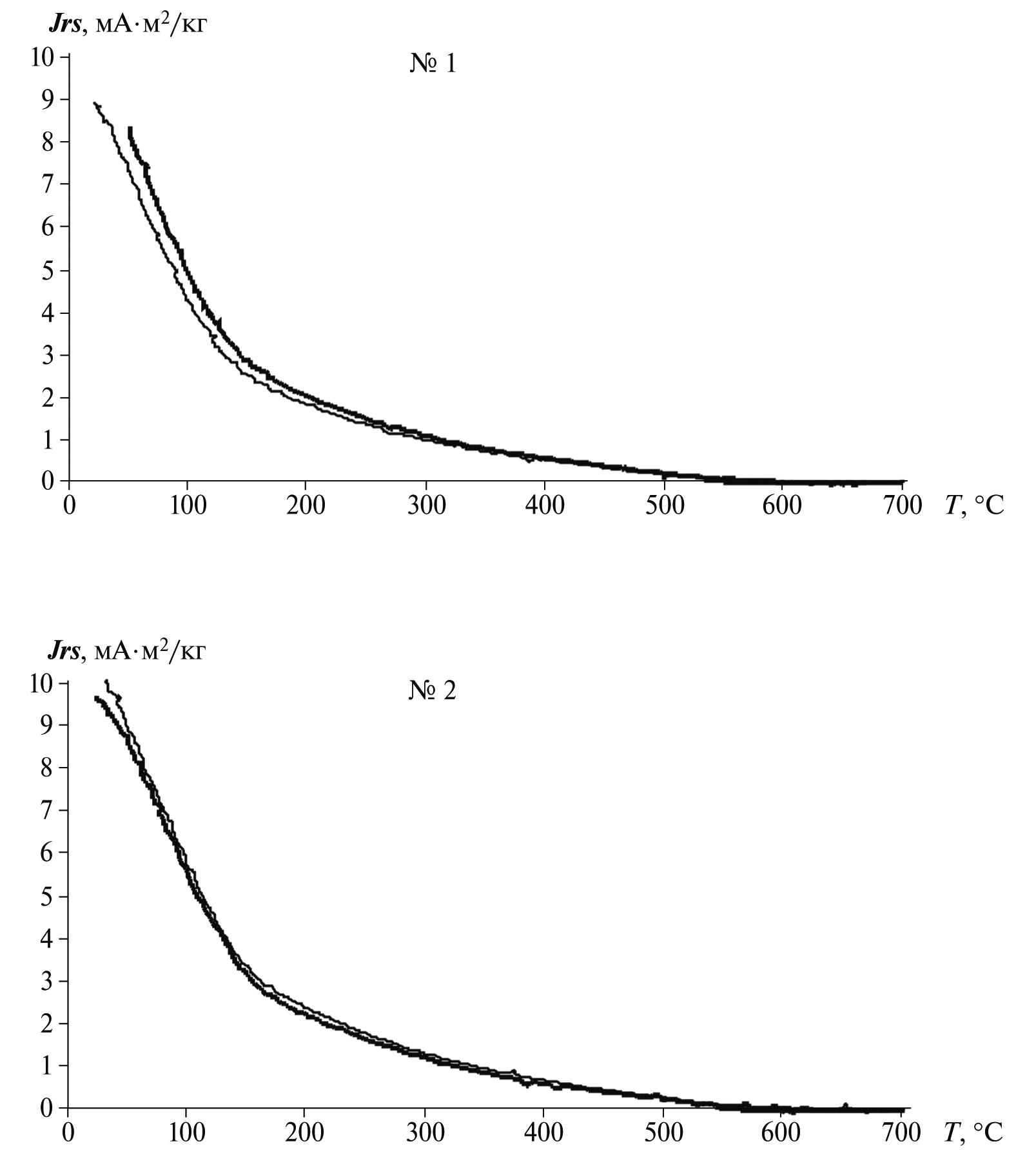 Рис. 2. Примеры термомагнитного анализа по зависимости остаточной намагниченности насыщения Jrs от температуры T. Жирная линия – первый нагрев, тонкая линия – второй нагрев. № 1, № 2 – номера пластин.