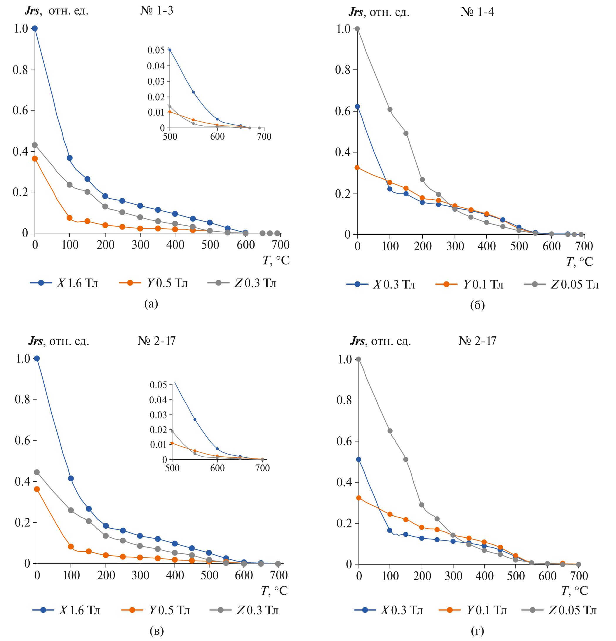 Для разделения спектров блокирующих температур высоко- и низкокоэрцитивных минералов выполнен ТМА по методике [Lowrie, 1990] на трех образцах-дублях. Образцы намагничивались в трех ортогональных направлениях: по оси Х в поле 1.6 Тл, по оси Y в поле 0.5 Тл и по оси Z в поле 0.3 Тл на установке ASC IM-100 Impulse Magnetizer (США). Далее образцы ступенчато нагревались в терморазмагничивающей установке TD48 (ASC-Scientific, США) от 50 до 650°С с шагом 50°С, а, начиная с 650 до 690°С с шагом 20°С. Затем строились кривые размагничивания остаточной изотермической намагниченности Jrs отдельно для каждой компоненты.