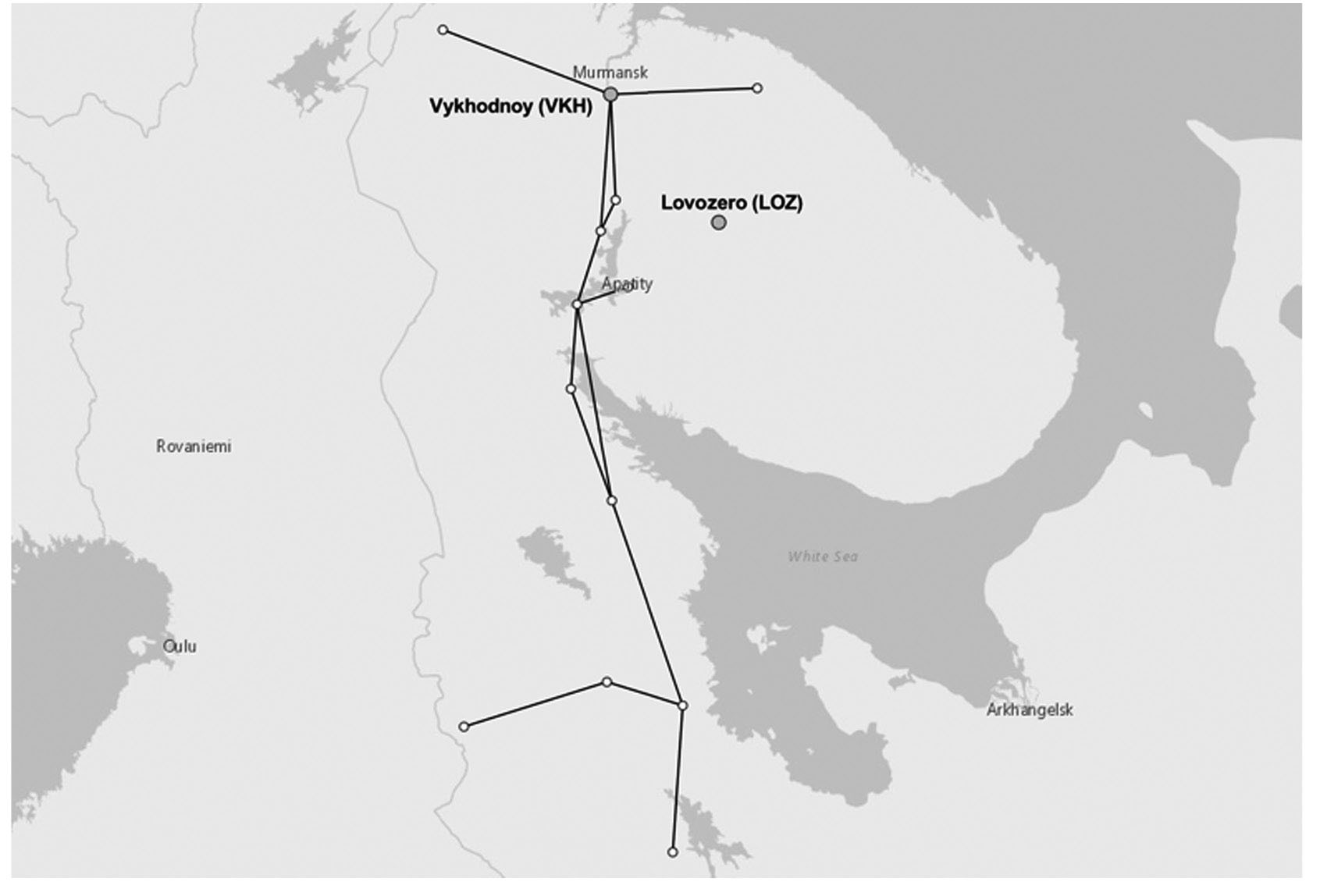 Рис. 1. География магистральной электрической сети “Северный транзит” (сплошная черная линия), обсерватории “Ловозеро” (LOZ) и трансформаторной подстанции “Выходной” (VKH).