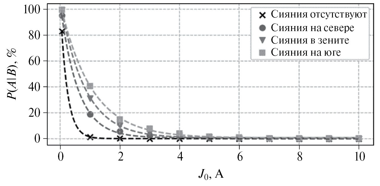 Также показано, что вероятность превышения ГИТ некоторого определенного значения имеет экспоненциальный характер, явно зависит от области проявления сияний, и может быть аппроксимирована выражением вида P(A|B) ≈ P(J₀) = a · exp(bJ₀) + c, где P(A|B) – вероятность превышения ГИТ определенного значения J₀ при наблюдении сияний в заданной области; a, b и c – коэффициенты, определяемые эмпирическим образом.