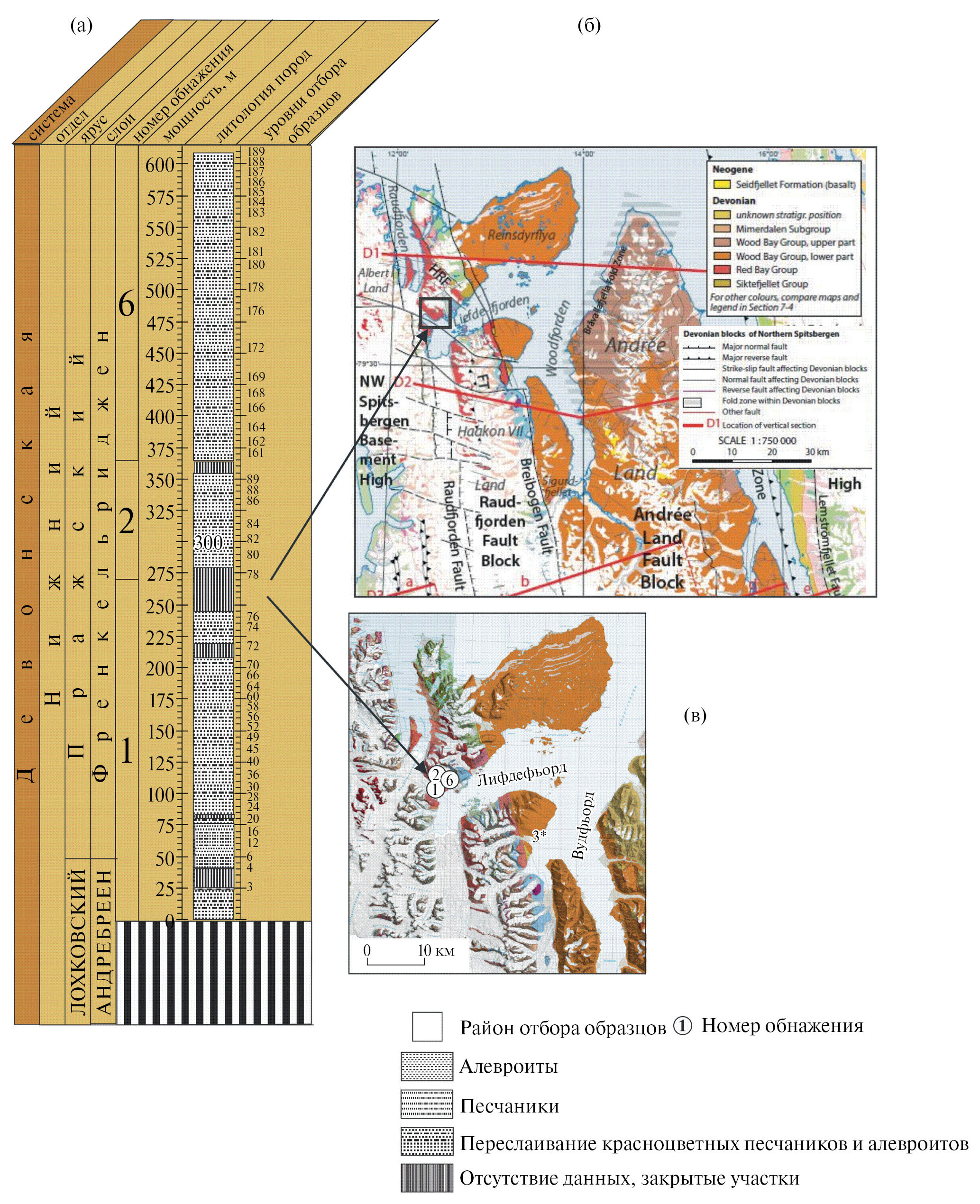 Рис. 1. Схема расположения обнажений девонских отложений и стратиграфическая колонка по изученному разрезу в районе северного берега Лифде-фьорда: (а) – литолого-стратиграфическая колонка, стратиграфические уровни отбора образцов в разрезе свиты Френкельриджен; (б) – тектоническая карта (фрагмент) острова Западный Шпицберген [Geoscience ..., 2015; Dallmann et al., 2015]; (в) – место отбора образцов и номера обнажений на геологической карте [Dallmann et al., 2005].