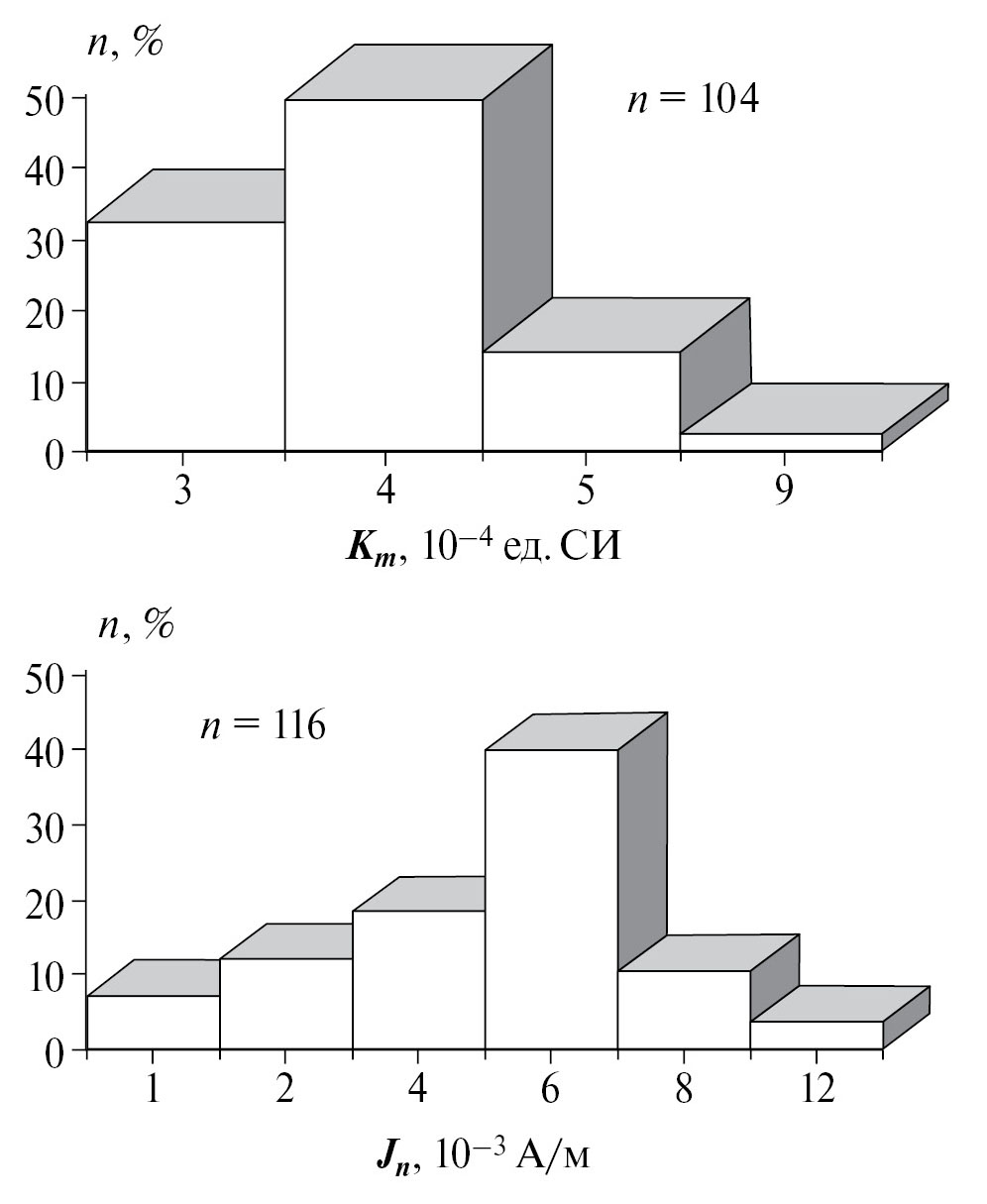 Значения скалярных магнитных характеристик: естественной остаточной намагниченности (Jₙ) и объемной магнитной восприимчивости (Кm) для изученных пород изменяются в небольших пределах (табл. 1). Средние значениям Jₙ и Kₘ образцов 4.2 мА/м и 3.4 × 10–4 ед. СИ соответственно. Такие значения указывают на то, что минералы, содержащиеся в породе, относятся к слабомагнитным, по отношению к магнетиту и титаномагнетиту [Шолпо, 1986]. Распределения значений Jₙ и Kₘ отличаются от нормальных и имеют классический логнормальный характер, рис. 2.