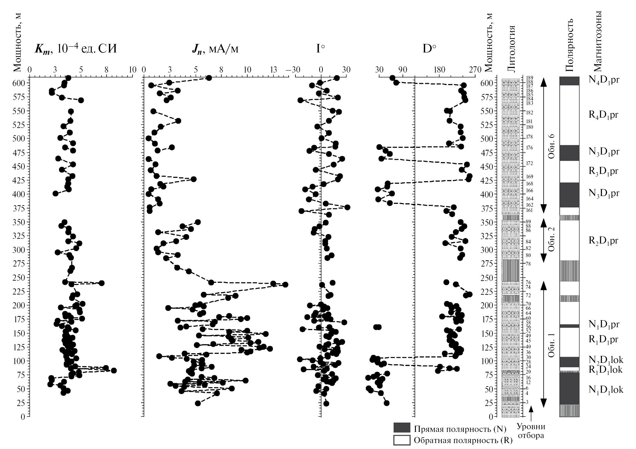 Изменения величины Jₙ по нижней части разреза (25–250 м) в пределах 3–13 мА/м при среднем около 8 мА/м. Выше по разрезу идет постепенное снижение величины Jₙ до уровня 1.5 мА/м. Такие изменения Jₙ могут указывать на существенные изменения условий седиментации в отдельные отрезки геологического времени. Границы толщ различной Jₙ являются плоскостями раздела, фиксирующими фациальные сдвиги в областях и/или изменения тектонической обстановки в областях сноса [Молостовский, 1986]. Также различие Jₙ по разрезу может быть следствием вторичных преобразований горных пород, однако существенных различий в палеомагнитной записи верхней и нижней части разреза не наблюдается (см. раздел Обсуждение).