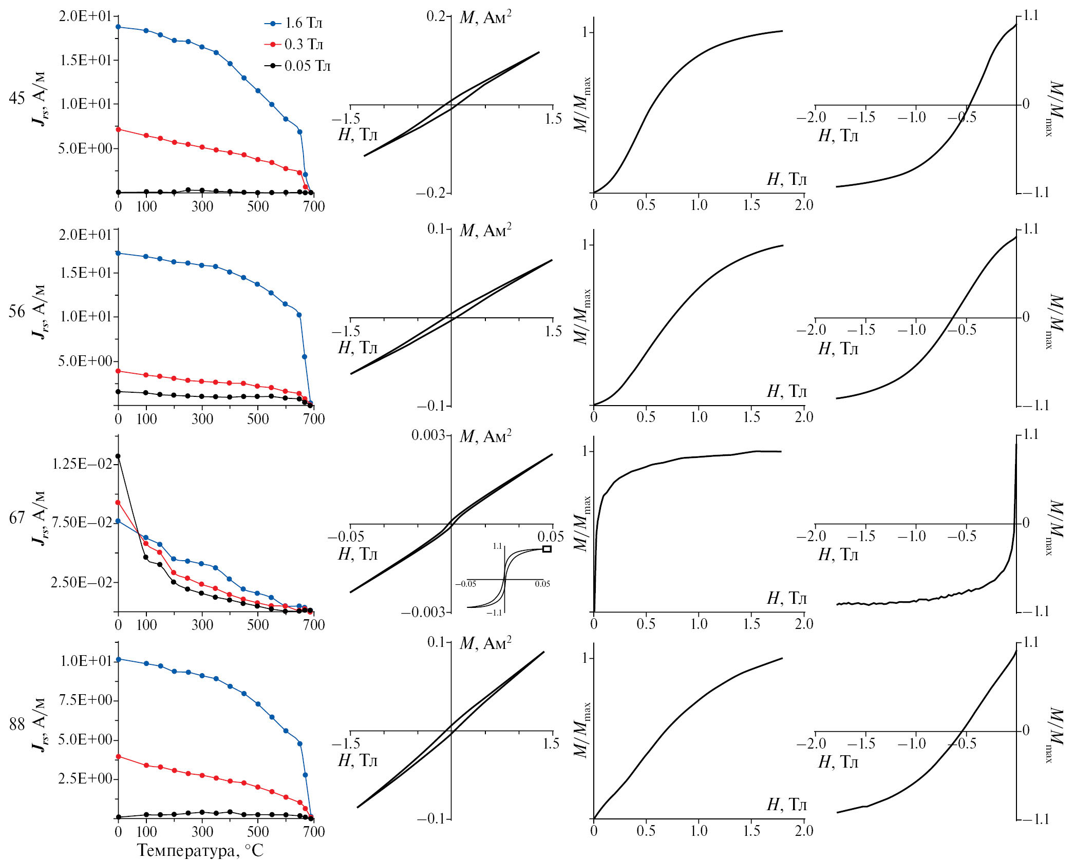 Рис. 4. Результаты экспериментов по методу Лаури [Lowrie, 1990] и гистерезисные характеристики для образцов нижнедевонских пород о. Западный Шпицберген. Слева направо: кривые терморазмагничивания жестких и мягких компонентов Jrs, образованных при намагничивании в полях 1.6 Тл по оси X, 0.3 Тл по оси Y и 0.05 Тл по оси Z для образцов 45, 56, 67, 88, соответственно; петли гистерезиса; кривые нормального намагничивания Jr ; кривые разрушающего поля Hcr.
