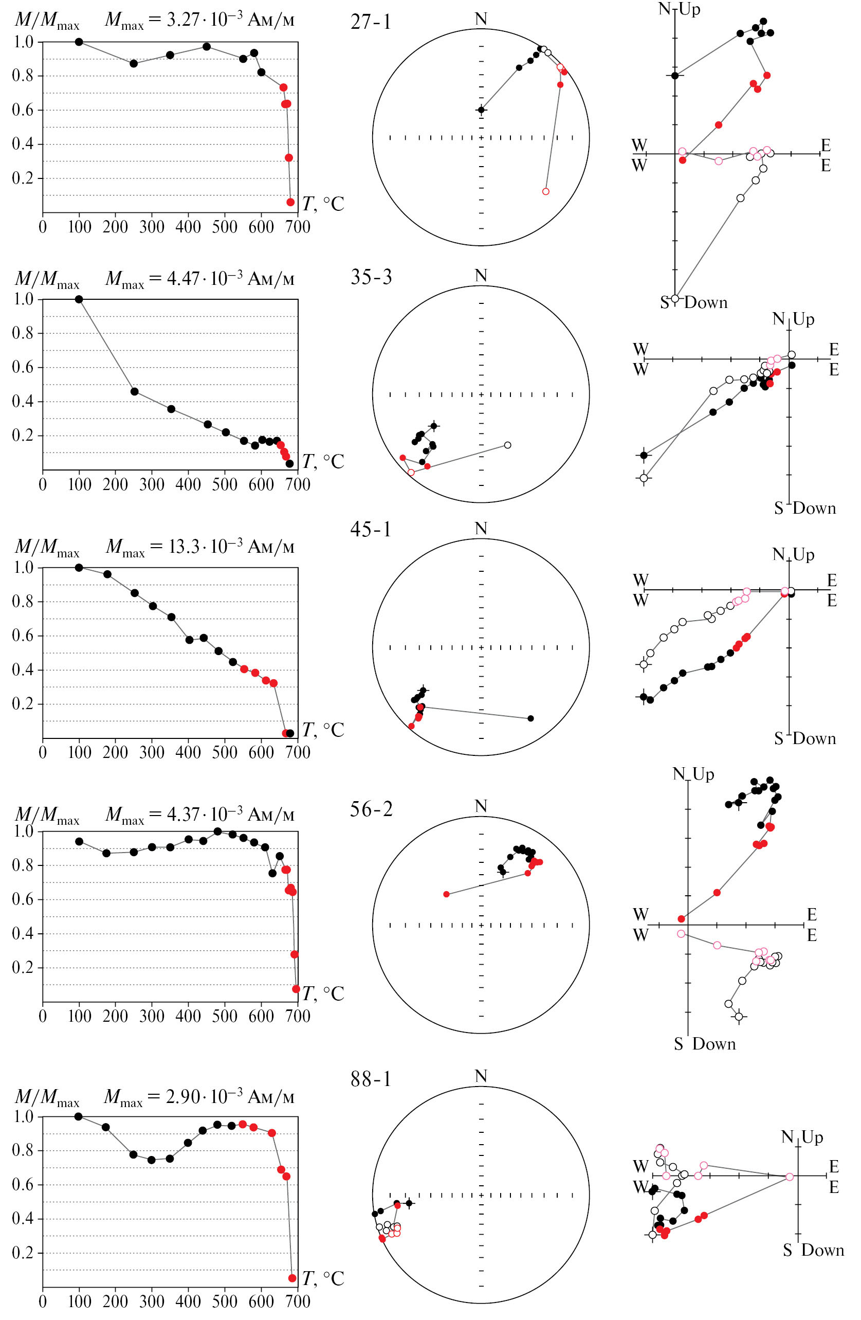 Рис. 6. Примеры терморазмагничивания девонских образцов горных пород температурой (пустые кружки – проекция вектора в вертикальной меридиональной плоскости, залитые кружки – проекция вектора в горизонтальной плоскости; стратиграфическая система координат; остальные пояснения в тексте). обн. 1, 2, образцы 27-1, 35-3, 45-1, 56-2 и 88-1; обн.6, 168-4, 169-3, 171-4, 181-3 и 189-5 (начало).