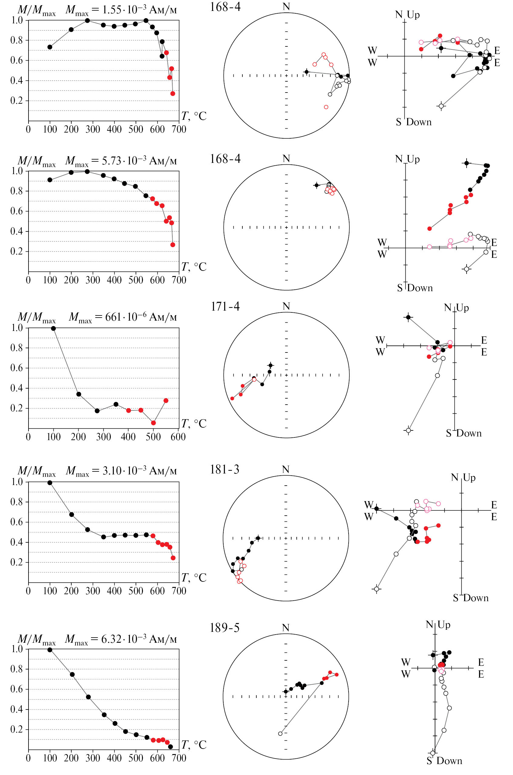 О возможном перемагничивании красноцветных девонских отложений указывалось в работах [Lovlie et al., 1984; Torsvik et al., 1985]. Для северных разрезов, где преобладают красноцветные отложения, статистически значимых компонент Jₙ, связанных с позднепалеозойским перемагничиванием, нами раньше не выявлялось. В данной работе в редких случаях, выделяются компоненты, соответствующие позднепермскому перемагничиванию в образцах серо-зеленных песчаников и алевролитов (обн. 2 и 6; 7 образцов), что статистически малозначимо. Отдельно стоит вопрос о первичности записи компонент Jₙ. Диапазоны деблокирующих температур, по которым выделяются компоненты Jₙ разной полярности, не отличаются между собой. По породам, с магнитным носителем гематитом, как правило, высокотемпературные диапазоны деблокирующих температур 500–675°С. В связи с несколько заниженными значениями деблокирующих температур Jₙ, которые предполагаются для гематита, а также на основании результатов теста Лаури, где отмечается магнитный минерал с температурами деблокирования >650°С и намагничивающийся в полях до 0.3 Тл, есть вероятность, присутствия мелкозернистого гематита. Образцы из сероцветных отложений, содержащих магнитные минералы, предположительно, титаномагнетитового ряда размагничиваются в диапазоне 350–500, 580°С. В некоторых случаях наблюдаются химические изменения в ходе нагрева (рис. 6, образец 171-4) или происходит разрушение образцов. Изменения до 600°С происходят, как правило, в образцах из сероцветных отложений обнажения 6 и выделение характеристических компонент Jₙ для этих интервалов весьма проблематично. Данные по таким образцам не использовались. В этом случае для оценки направлений использовались результаты, полученные по кругам размагничивания для соседних участков (ниже и выше по разрезу).