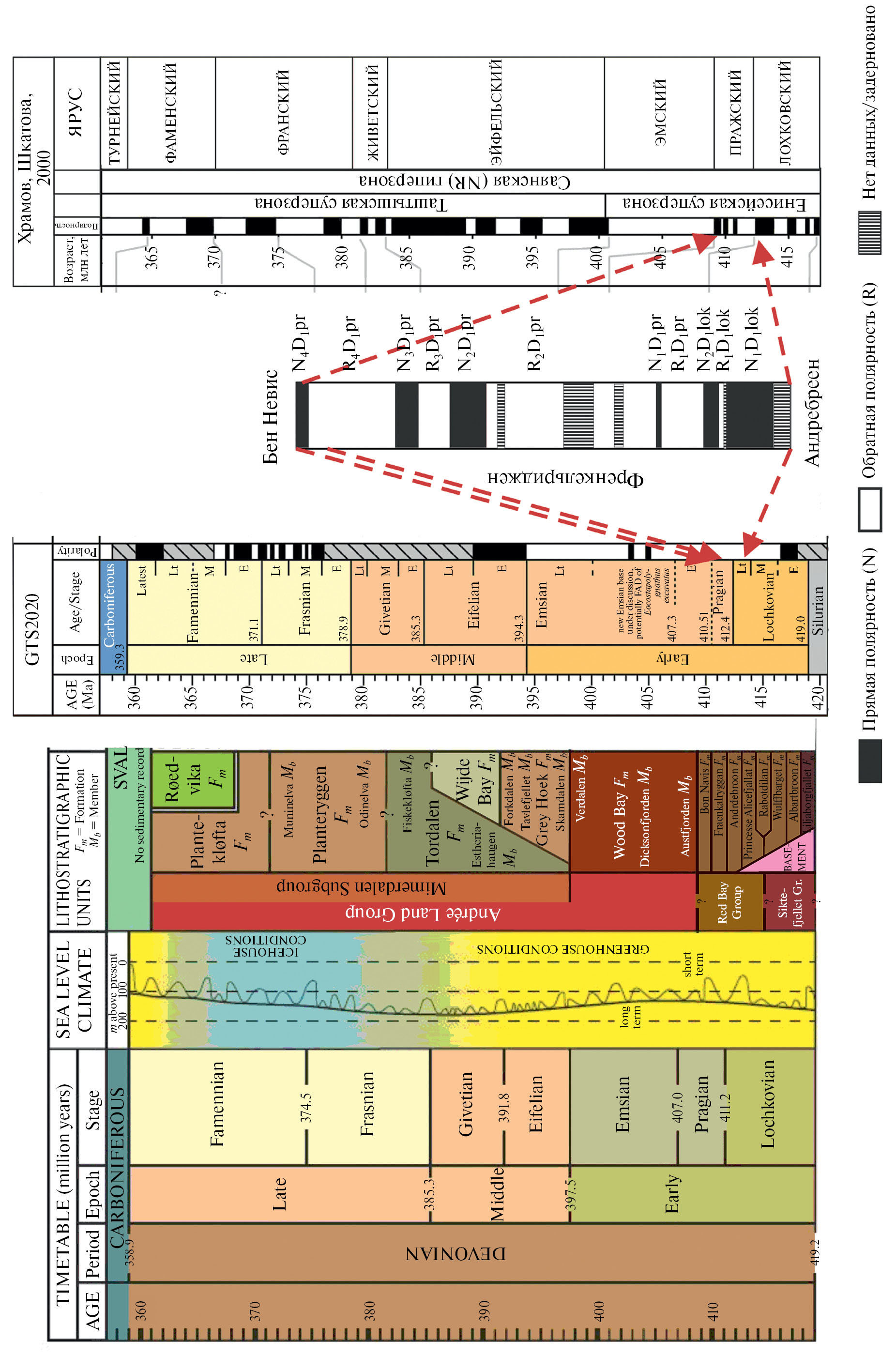 Рис. 8. Корреляция выделенных магнитозон по свите Френкельриджен с общей магнитостратиграфической шкалой. Слева направо: положение серии Ред Бей по отношению к общей стратиграфической шкале [Geoscience Atlas..., 2015 (рисунок модифицирован после [Blomeier et al.,2003]); магнитостратиграфическая шкала девонского периода GTS2020; магнитозоны для свиты Френкельриджен и для зоны контакта со свитой Андребреен, полученные в данной работе, дополненные данными по свите Бен Невис [Иосифиди, 2015]; магнитостратиграфическая шкала 2000 [Храмов, Шкатова, 2000]. Возможная корреляция выделенных магнитозон, показана красными стрелками.