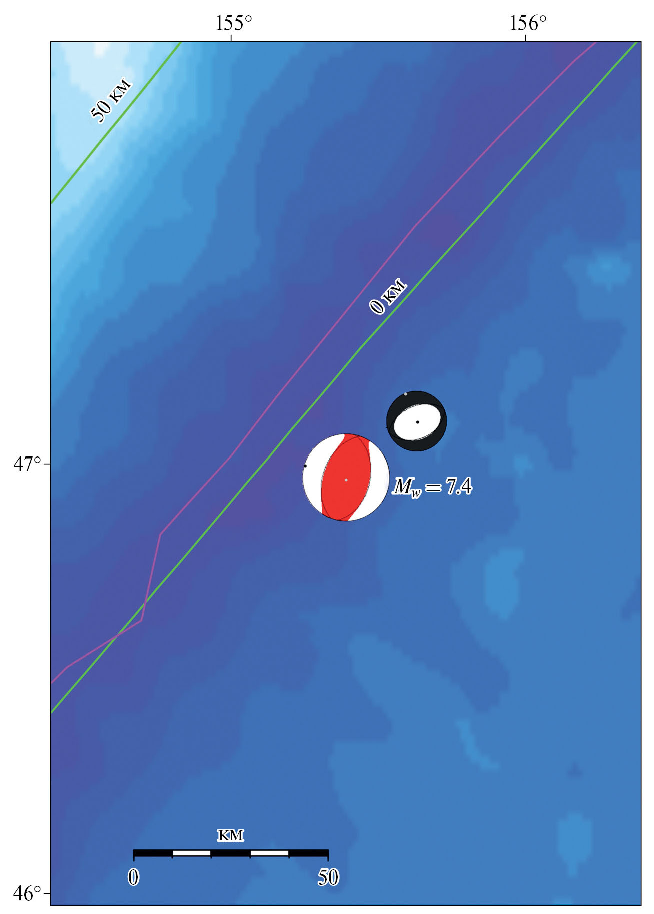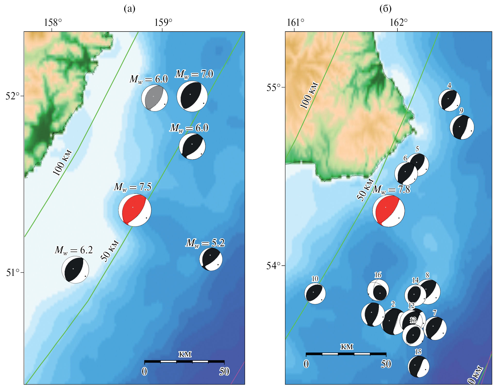 Модель образования афтершоков развития и последействия выглядит физически обоснованной, но само явление не носит универсальный характер. Афтершоки сильнейших неглубоких землетрясений на Камчатке чаще наследуют тип движения главного толчка. Для примера показаны механизмы двух сильных неглубоких (h < 80 км) землетрясений с Mw ≥ 7.5 – 08.06.1993 г. и 05.12.1997 г. (рис. 1). Механизмы главных толчков и их афтершоков практически идентичны. Но совершенно иная картина для землетрясения 15.01.2009 г. Mw = 7.4 (рис. 2). Представленные механизмы – это решения тензора центроида момента по методике [Dziewonski, Woodhouse, 1983], которая принципиально отличается от методики определения механизма по знакам первых вступлений, к которой следует относиться осторожно. Как было показано в работе [Aki, Richards, 1980], есть большая вероятность ошибочного определения знака первого движения Р-волны при высоком уровне микросейсмического шума, особенно при использовании аналоговых сейсмограмм.