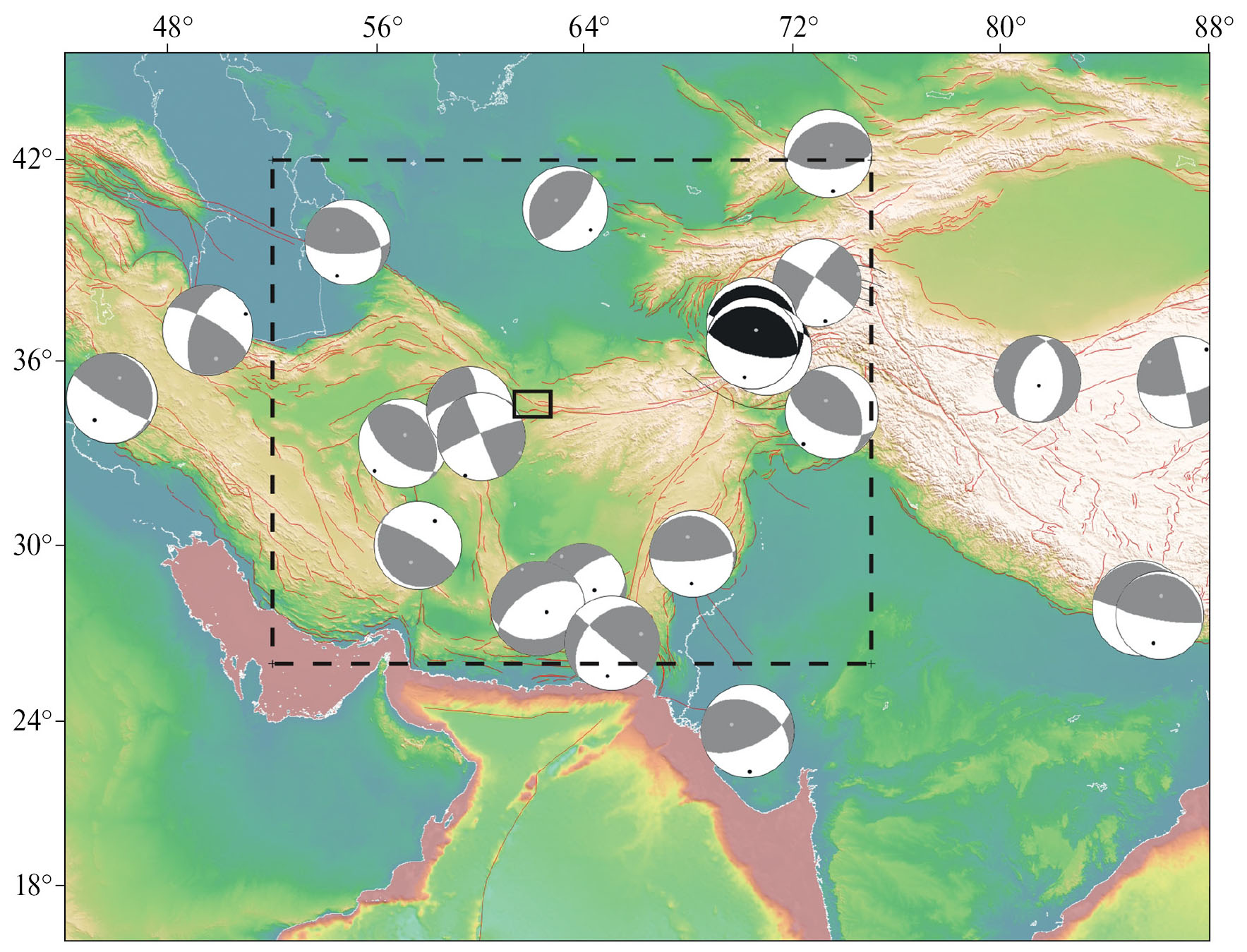 На рис. 4 показаны механизмы очагов землетрясений по данным Global CMT1. Следует отметить отсутствие сильных землетрясений, связанных с разломом Налбандан. Отметим также разнообразие механизмов очагов: взбросы, сбросы, сдвиги. Это отражает сложный характер взаимодействием активных структур – погружение в зоне субдукции, наличие реликтовых зон субдукции, крупные сдвиговые разломы, микроплиты, сильно деформированные складчатые зоны. Отметим сильное землетрясение с механизмом чистый сдвиг по близвертикальной плоскости по разлому Небандан на расстоянии около 100 км к западу от очага Гератских землетрясений.
