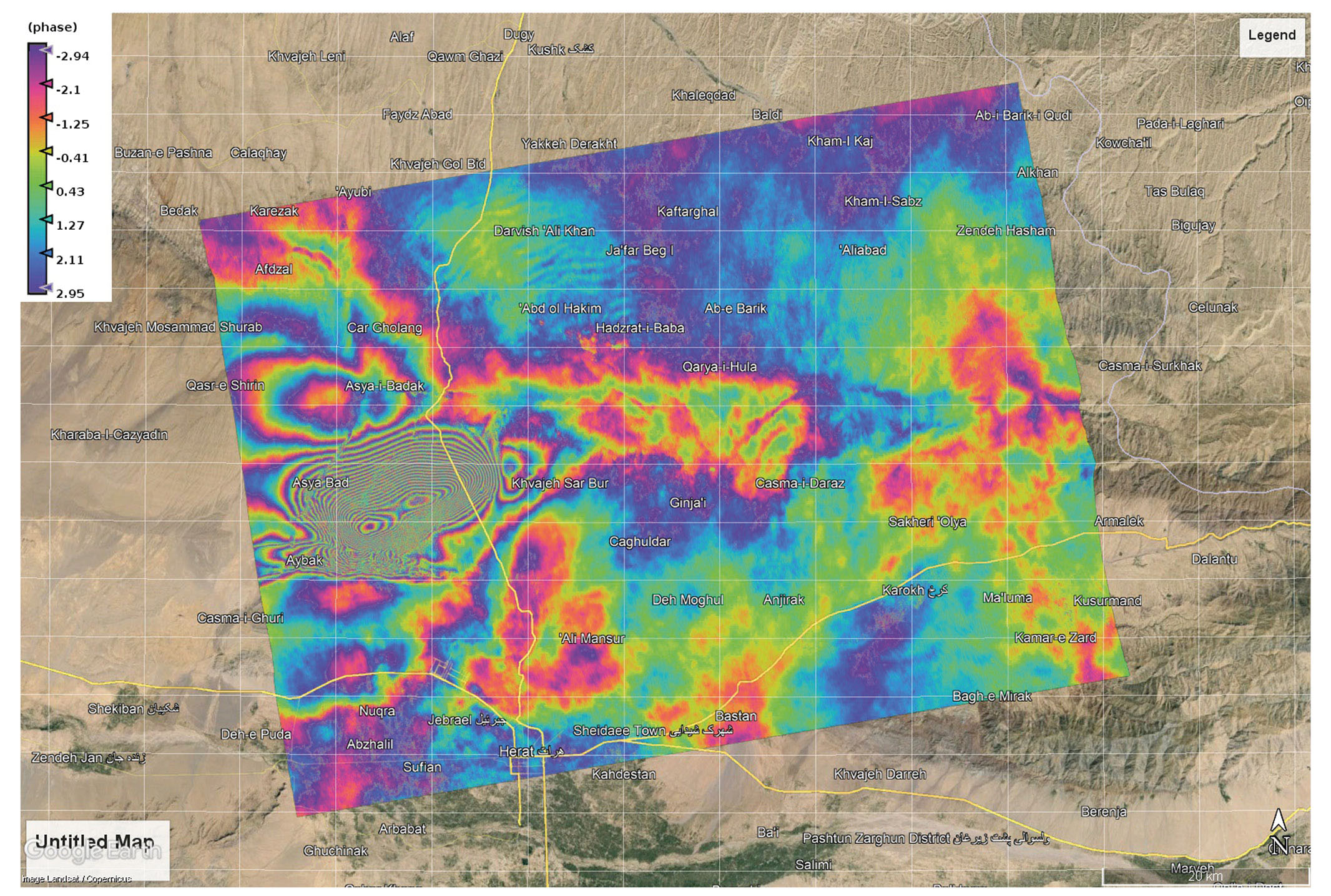 Рис. 9. Фазовая неразвернутая интерферограмма для двух землетрясений 11 и 15 октября 2023 г. Каждый цветовой цикл (от синего до красного цвета) соответствует фазовому сдвигу на 2π радиолокационного сигнала, отраженного от одной и той же площадки земной поверхности при первой и второй съемке. Это равно смещению 28 мм в направлении на спутник за период съемки.