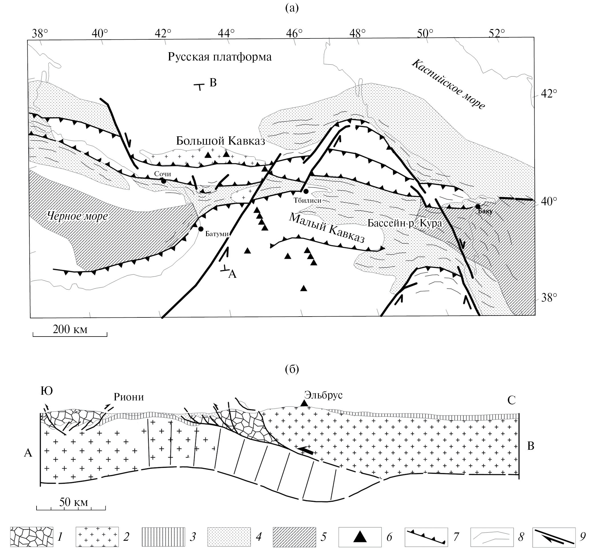 Рис. 1. Упрощенная структурная схема Кавказа (а) и разрез по линии А–B (б) с учетом работы [Philip, Gvishiani et al., 1989]: 1 – осадочные породы; 2 – континентальная кора; 3 – кора краевого бассейна; 4 – молодые осадочные бассейны; 5 – океаническая кора; 6 – вулканы; 7 – крупные надвиги; 8 – складки; 9 – крупные сдвиги.