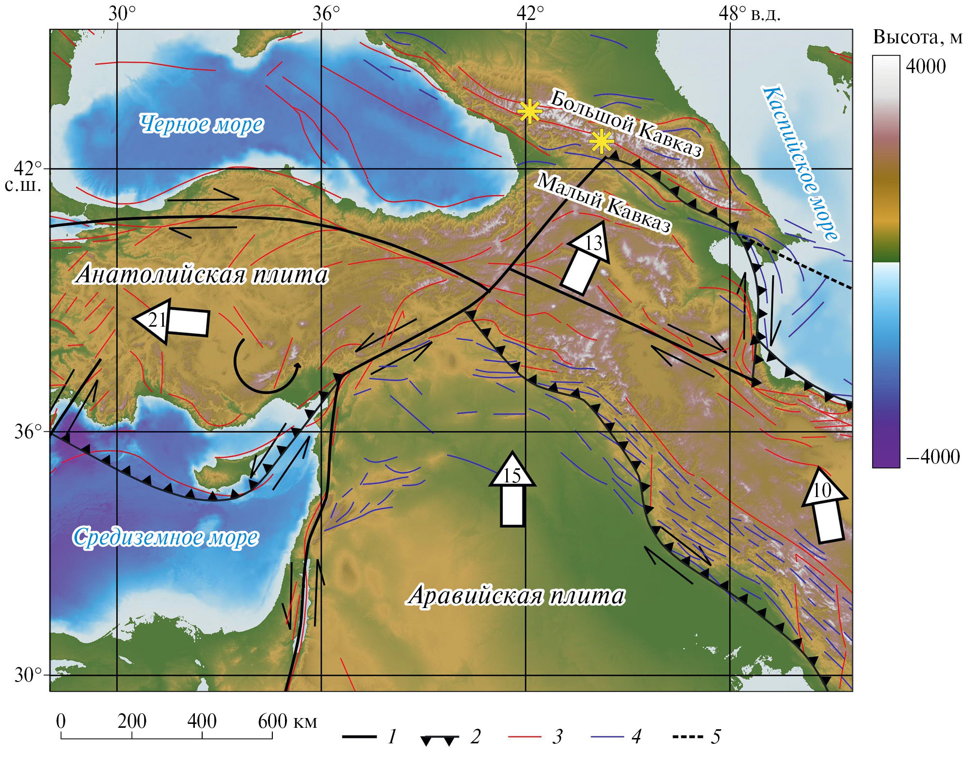 Рис. 2. Зона столкновения Аравийской и Евразийской плит по работе [Reilinger et al., 2006]: 1 – крупные тектонические сдвиги; 2 – границы зон сжатия (надвиги); 3 – разрывы; 4 – складки; 5 – предполагаемые разломы. Белые стрелки и цифры – направления и скорости движения плит (мм/год) относительно Евразии; желтые звезды – вулканы Эльбрус и Казбек.