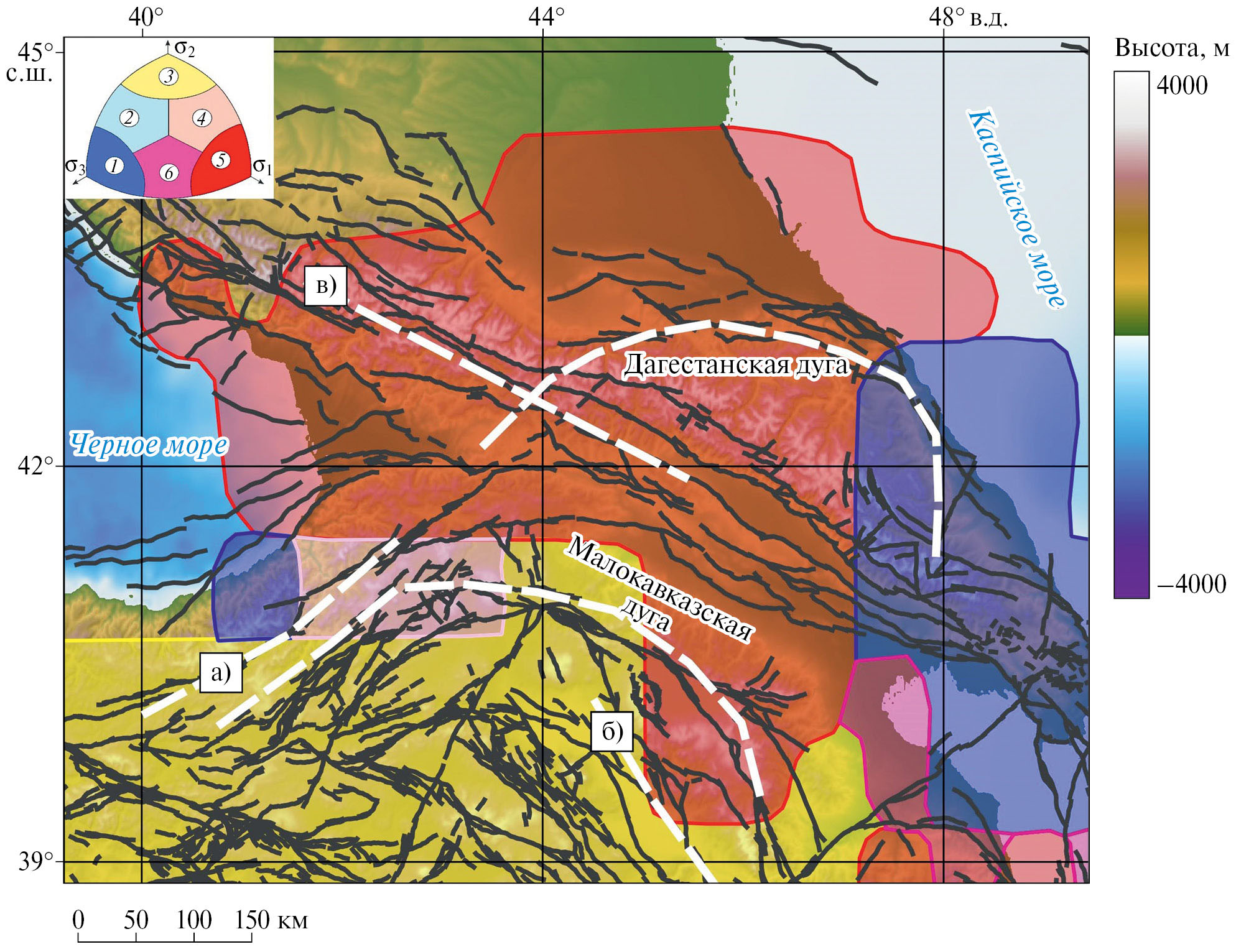 Рис. 3. Схема активных разломов Кавказа по работам [Бачманов и др., 2017; Zelenin at al., 2022] и районирование по геодинамическому типу напряженного состояния, построенного по каталогу механизмов очагов Global CMT [Ребецкий, 2020]. В верхнем левом углу показаны типы напряженного состояния: 1 – горизонтальное растяжение; 2 – горизонтальное растяжение со сдвигом; 3 – горизонтальный сдвиг; 4 – горизонтальное сжатие со сдвигом; 5 – горизонтальное сжатие; 6 – вертикальный сдвиг. Буквами и белыми пунктирными линиями показаны направления простирания систем разрывов для трех провинций – а), б), в).