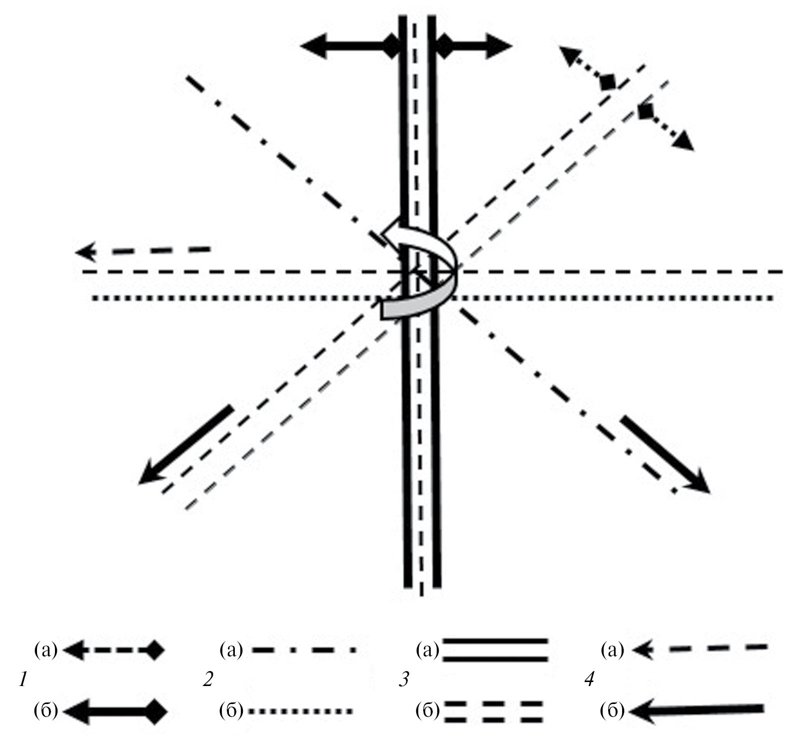 Рис. 6. Изменение поля напряжений Большого Кавказа в новейшее время [Лукина, 1983]: 1 – направления тангенциального сжатия: (а) – более ранние, (б) – более поздние; 2 – надвиги: (а) – более ранние, (б) – более поздние; 3 – раздвиги: (а) – более ранние, (б) – более поздние; 4 – направления смещения: (а) – более ранние, (б) – более поздние. Сдвиги имеют азимут простирания 315–330°; левые сдвиги – около 45°, надвиги и взбросы – 270–280°, раздвиги – 0–10°.