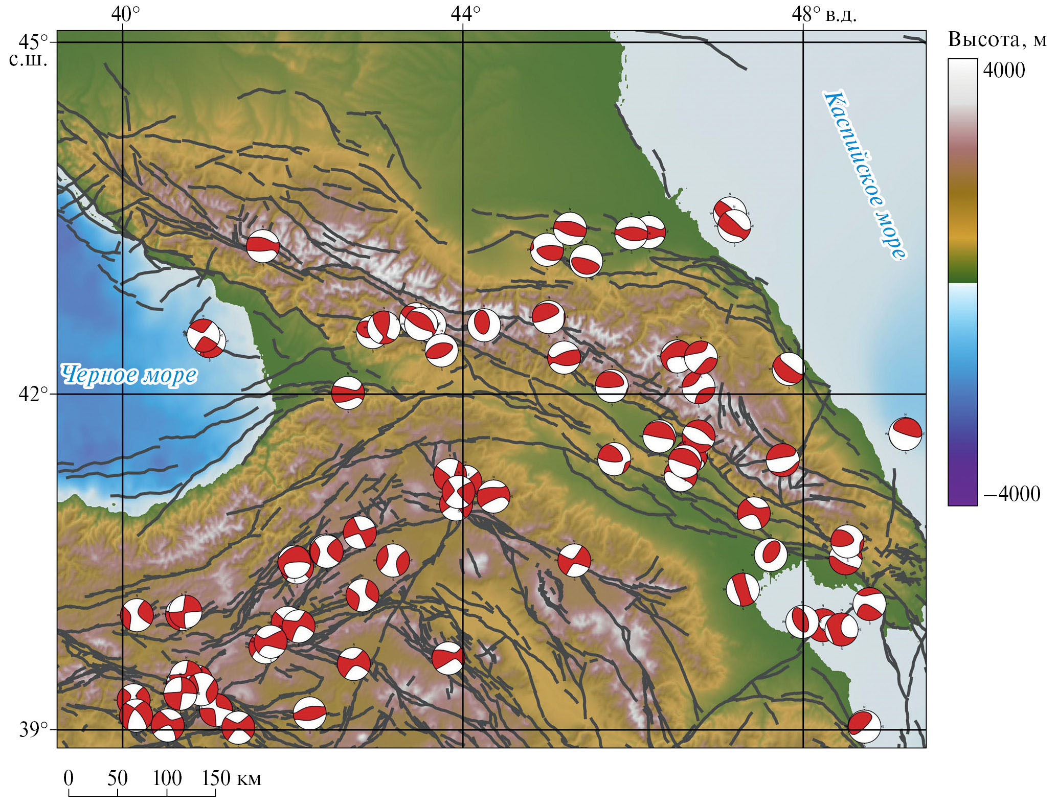 На рис. 4 показано распределение землетрясений с М > 4.0. Даже визуально можно заметить общие закономерности распределения землетрясений на территории Большого и Малого Кавказа: