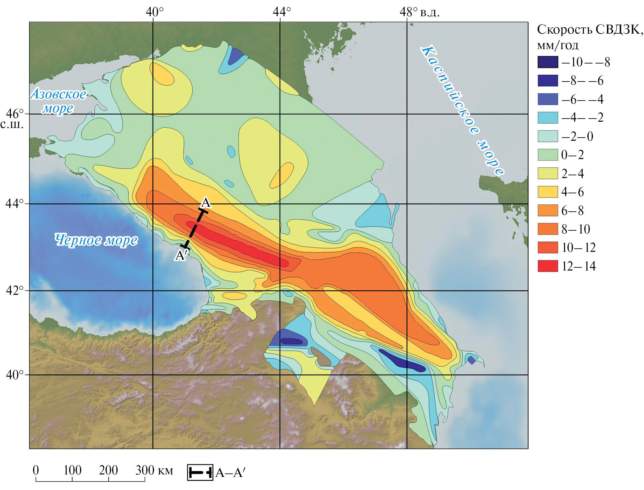 Рис. 11. Второй подъем Большого Кавказа (1970/75–1985/92 гг.) [Кафтан и др., 1995]. А–А′ – профиль геометрического нивелирования Зеленчук–Сухуми.