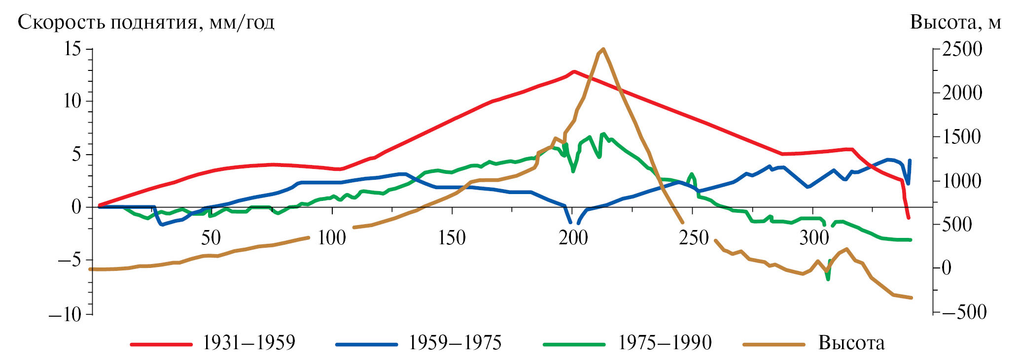 Рис. 12. Скорости вертикальных движений по линии нивелирования Зеленчук–Сухуми. Жирная коричневая линия – рельеф; красная, синяя и зеленая линии – графики изменения скоростей вертикальных движений для разных интервалов времени.