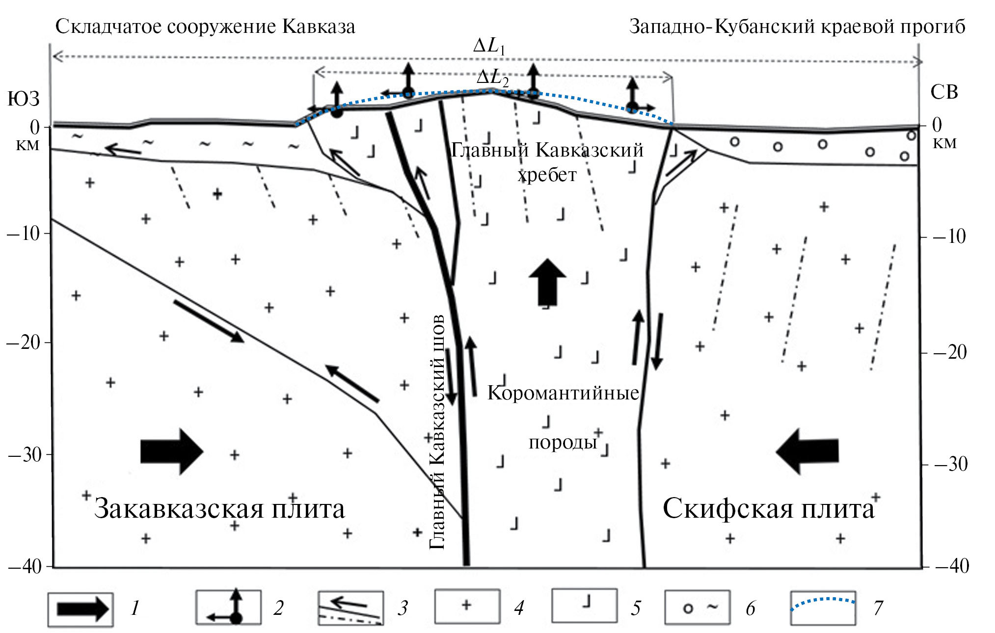 Большой Кавказский хребет согласуется с Главным Кавказским разломом, который является поддвигом Закавказского массива под Большой Кавказ под углом 60–75°. По сути, это шов между Евразийской плитой и консолидированной корой. Основные структурные субширотные нарушения Большого Кавказа в своем большинстве представлены надвигами (рис. 1б). Тектонические разломы Малого Кавказа имеют преимущественно сдвиговый механизм со взбросовой компонентой. Армянское нагорье, двигаясь на север под давлением Аравийской плиты (рис. 2), передает усилия, которые проявляются левосторонними и правосторонними смещениями по разломам, секущим центральную часть Большого Кавказа (рис. 1а), соответственно, на западе и на востоке [Милановский, Хаин, 1968].