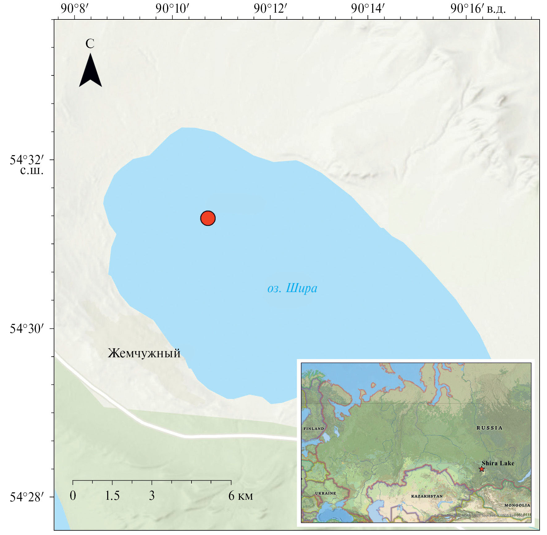 Озеро Шира (рис. 1) приурочено к бессточной впадине в пределах Ширинской денудационно-аккумулятивной субравнины. Длина озера – 9.35 км, ширина – 5.3 км, максимальная глубина – 23.8 м, средняя глубина – 11.0 м, абсолютная отметка уреза воды – 353.9 м. Дно озера ровное, максимальные глубины приурочены к его центральной части. В озеро впадает небольшая речка Сон, которая обеспечивает до 40% питания водоема, остальная часть питания осуществляется за счет атмосферных, подземных и антропогенных поступлений [Геология и минерагения…, 2006]. По химическому составу вода сульфатно-хлоридная, натриево-магниевая с щелочной реакцией (рН + 8.9–9.2). В составе солей присутствуют следующие компоненты: K++Na+ – 4.6 г/л; Ca2+ – 0.06 г/л; Mg2+ – 1.52 г/л; SO42– – 10.91 г/л; Cl– – 2.58 г/л, HCO– – 1.0 г/л [Геология и минерагения…, 2006].