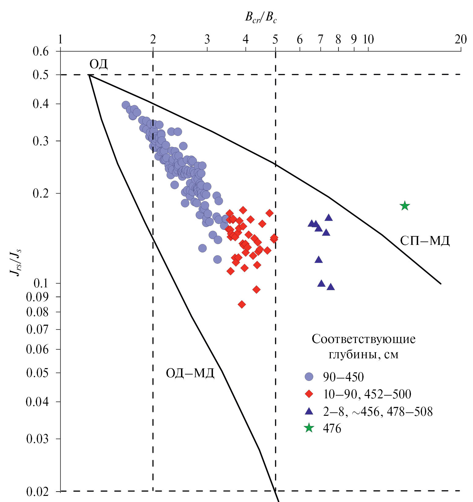 Согласно диаграмме Дэя [Day et al., 1977; Dunlop, 2002] образцы по большей части представлены смесью однодоменных (ОД) и мелких псевдооднодоменных (ПОД) частиц (на рис. 4 они показаны фиолетовым цветом). По гистерезисным параметрам образцы на диаграмме группируются в четыре кластера с различным наполнением. Группа, выделенная синим цветом, относится к самым верхним (граница вода–осадок) образцам, также часть образцов из этой группы находится на глубинах ниже 4.5 метров, неравномерно распределенных до глубины 5.08 м. Наиболее многочисленная группа, обозначенная фиолетовым, в основном приурочена к глубинам 90–450 см, некоторые образцы также расположены выше по колонке. Образцы, относящиеся к группе, обозначенной красным, происходят из двух интервалов 10–90 и 452–500 см, в которых также присутствуют образцы других групп. Зеленая звездочка соответствует образцу с глубины 476 см.